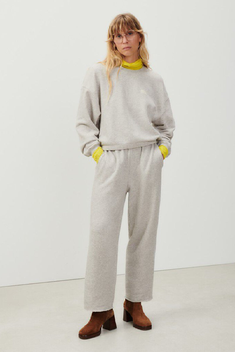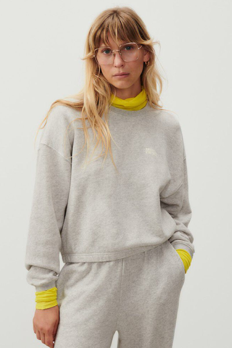 Pehmoinen harmaa collegepaita American Vintagelta. Paidassa on rento ja aavistuksen ylimitoitettu istuvuus, pyöreä pääntie ja tiputettu olkapäälinja. Yksityiskohtana edessä logoprintti.