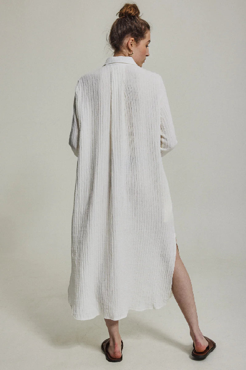 Yksinkertainen pitkähihainen mekko ruotsalaiselta AVENYltä upealla klassisella leikkauksella ja pehmeällä tekstuurilla. Edessä nappikiinnitys ja sivuilla korkeat halkiot sekä taskut. Materiaalina hengittävää luomupuuvillaa joka tekee mekosta täydellisen niin helteeseen kuin viileämpäänkin kesäsäähän.