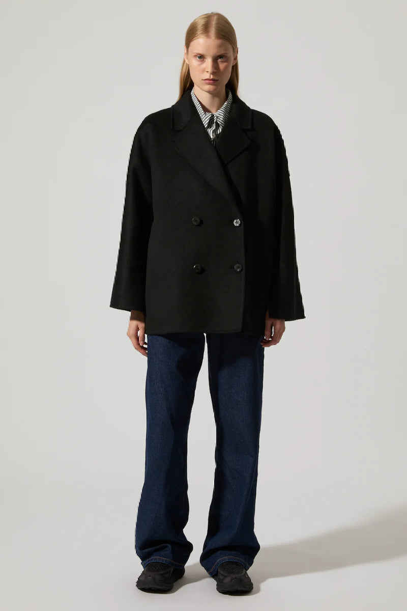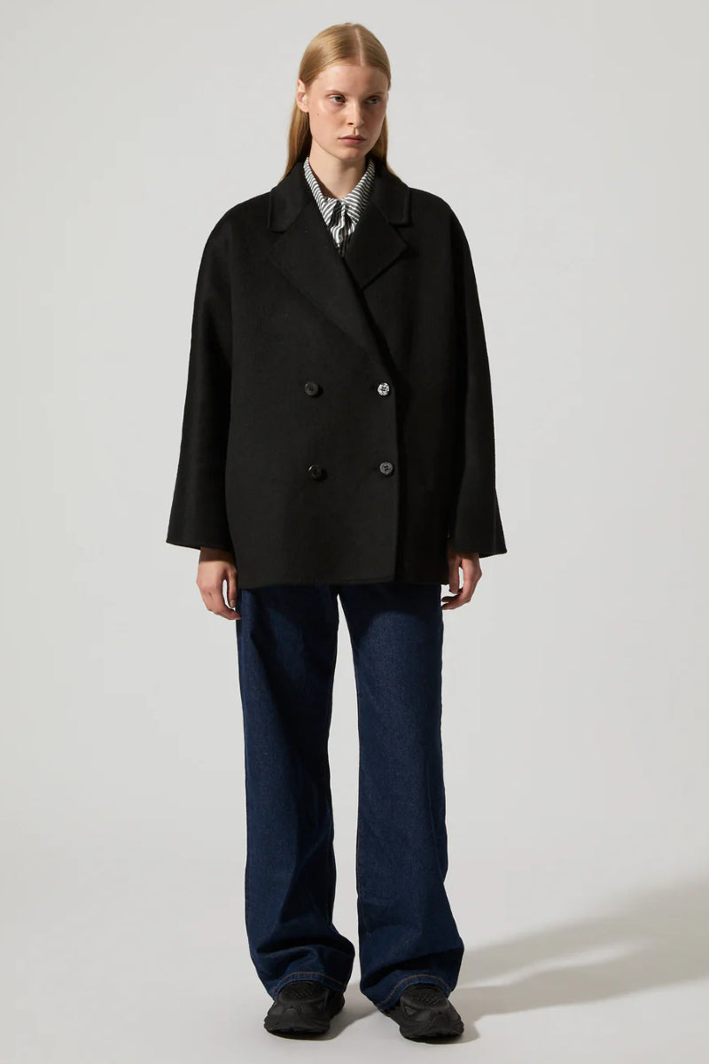 Kevyestä ja pehmeästä villasekoitteesta valmistettu villakangastakki Brixtol Textilesiltä. Suloisen pehmeä materiaali on kestävä ja näyttää hyvältä pitkään. Takissa yhdistyvät perinteinen kaksirivinen napitus ja ajankohtainen cropattu leikkaus. Leveät hihansuut halkioilla ja kaula-aukon käänne viimeistelevät takin täydellisesti.