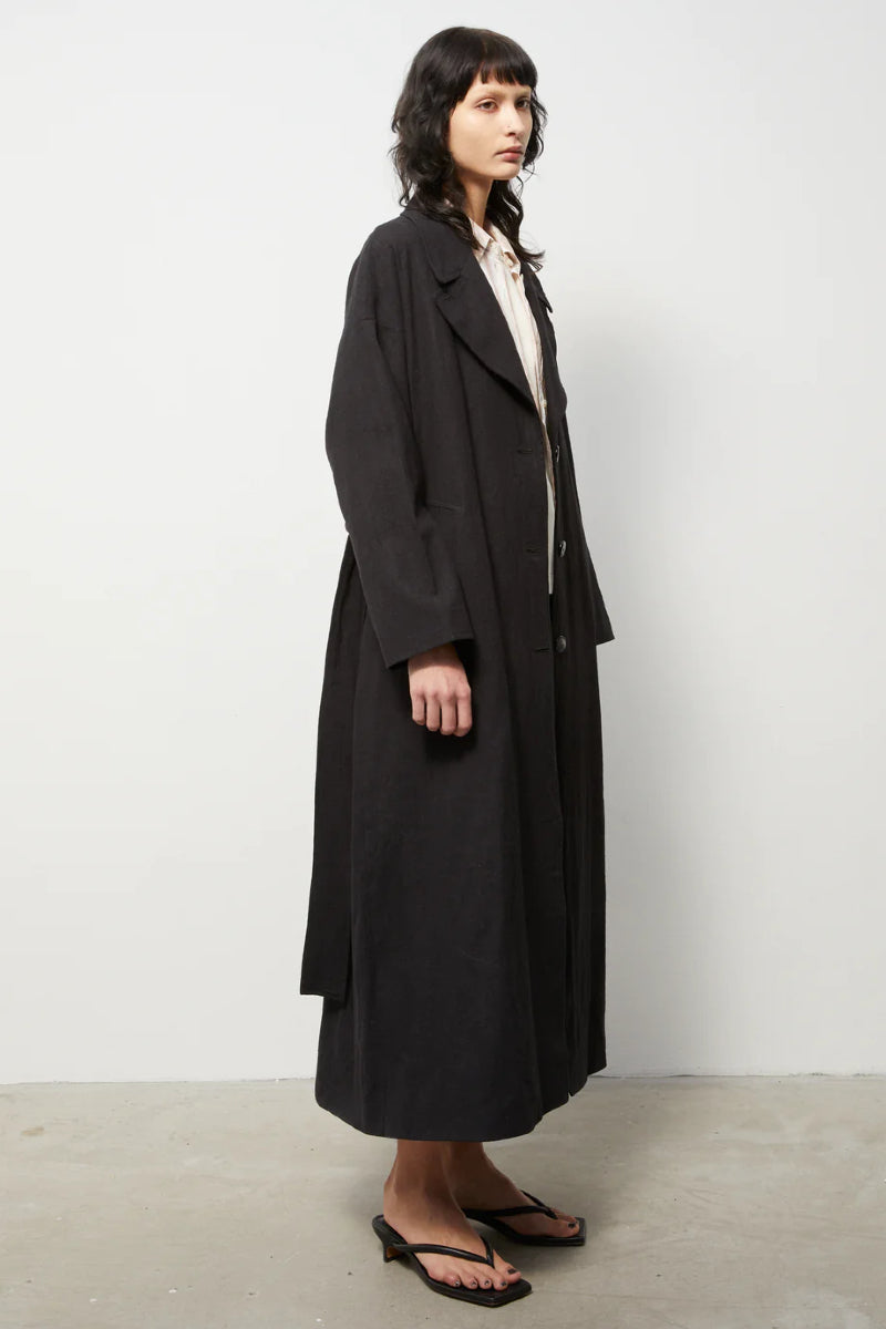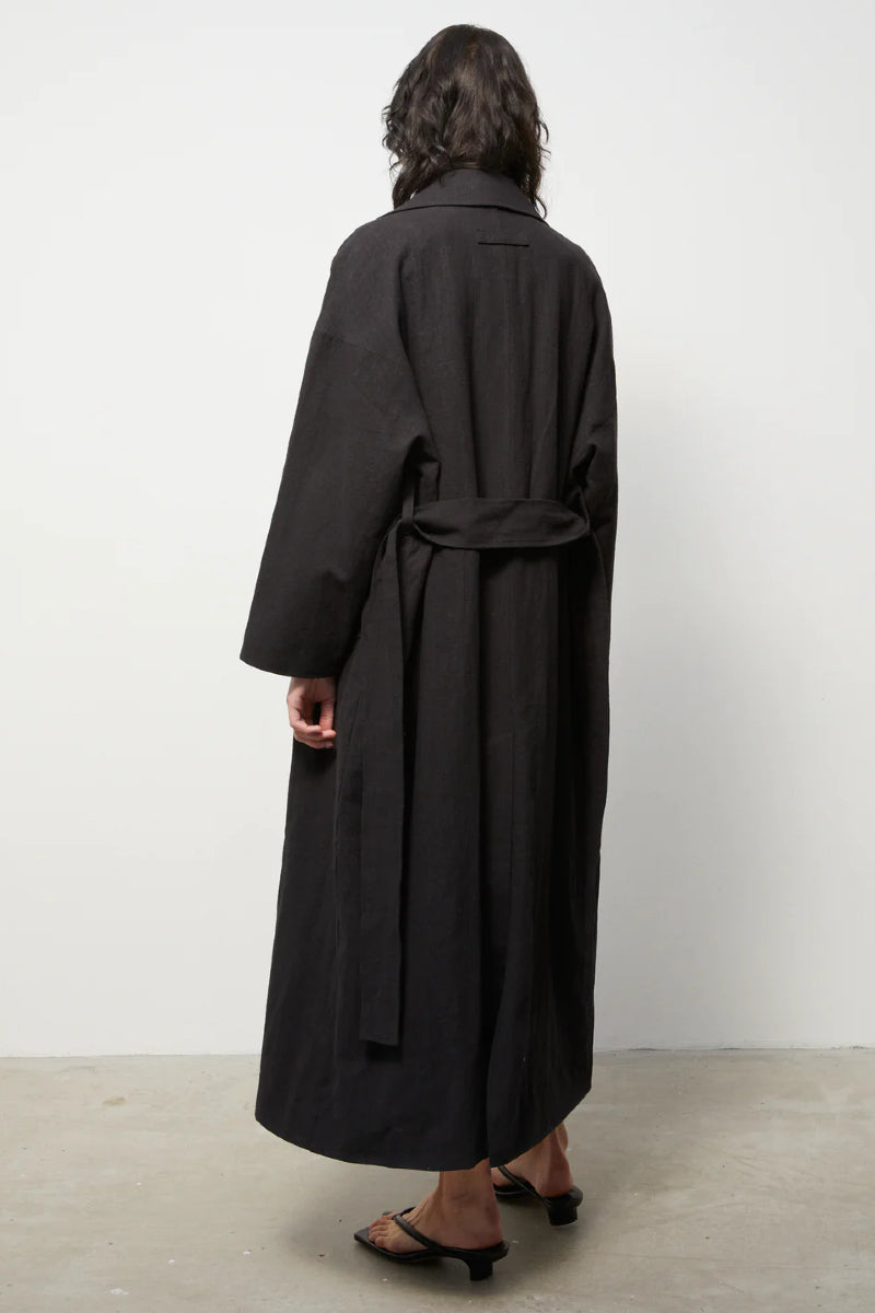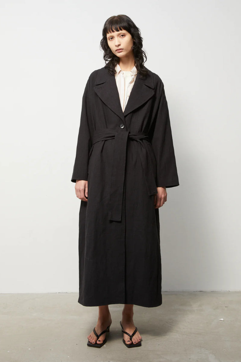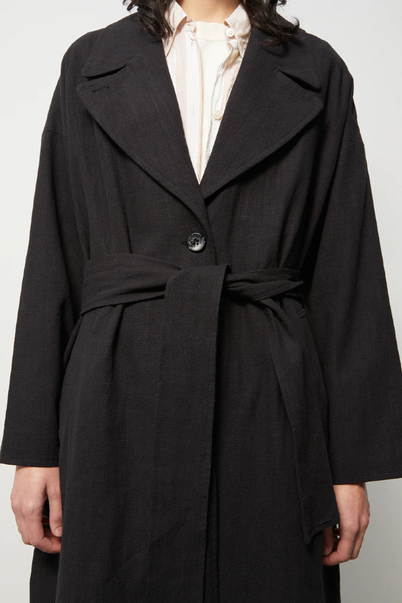 Oversize patterned linen jacket from Brixtol Textiles. Made from a rich linen-cotton blend that has been washed soft. Stylish and generous collar, buttons on the front and a belt at the waist.