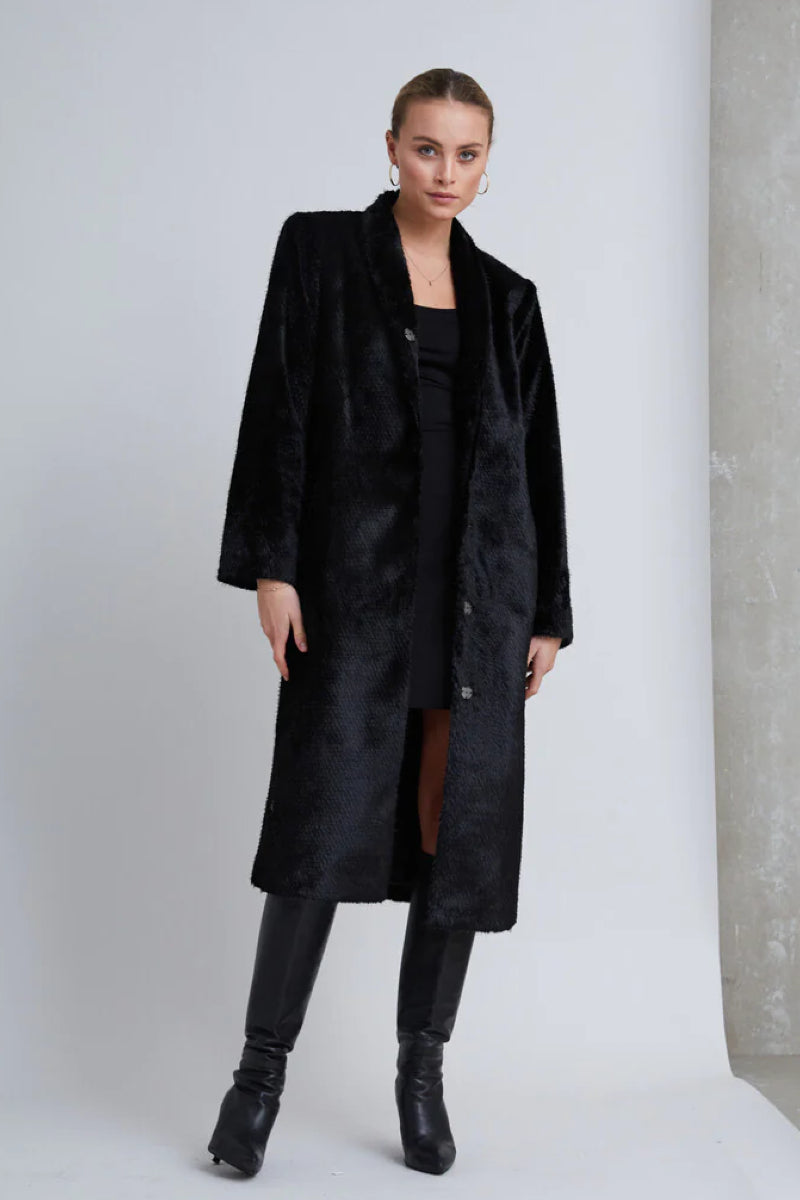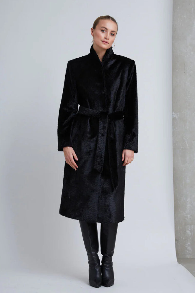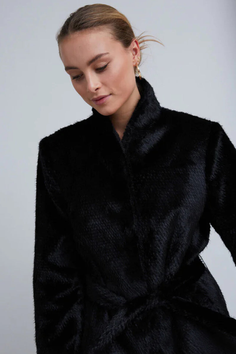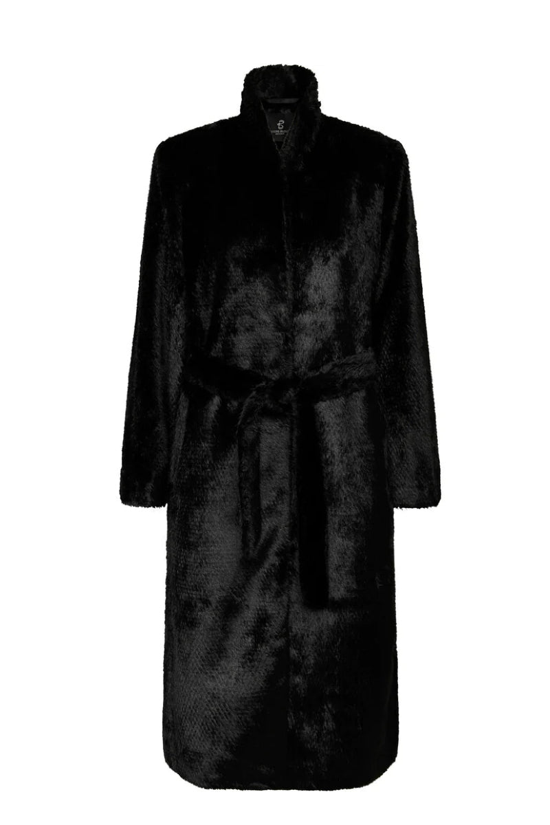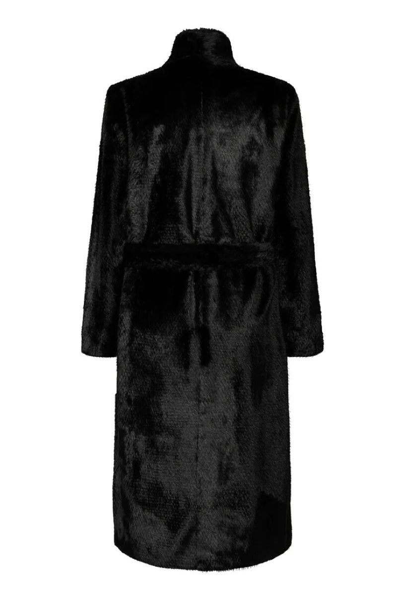 An elegant jacket from Bruuns Bazaar. The material is really soft long-pile fabric. The jacket has shoulder pads, a high collar, side pockets and press studs.