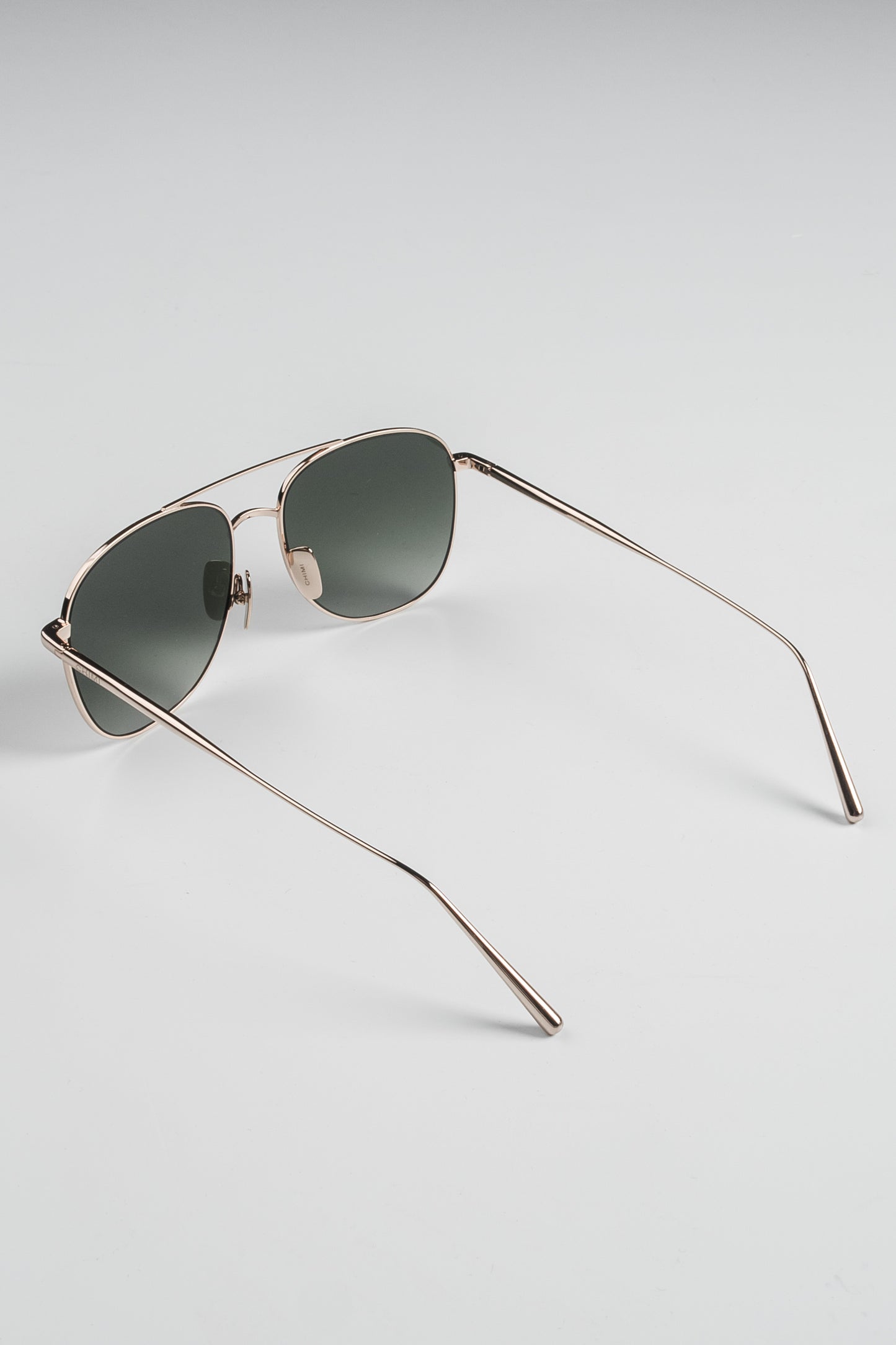 Classic angular shaped oval frames with large lenses. The frames are hand-crafted from matte gold-tone stainless steel and feature green polarized lenses.