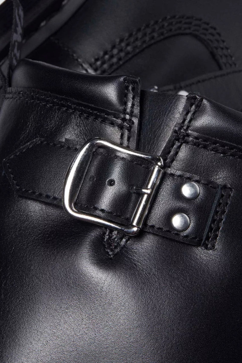 Dr. Martensin Anistone Hi biker-maihari on valmistettu 'Wanama'-nahasta, joka on kevyt nahka satiinimaisella ja kiiltävällä pinnalla. Varustettu hienoilla metalliyksityiskohdilla, kuten merkkilaatoilla ja säädettävällä soljella. Paksu Bex-pohja, jossa on tunnusomainen DM's-uritus ja keltainen pohjatikkaus. Viimeistelty klassisella kelta-mustalla kantalenkillä.