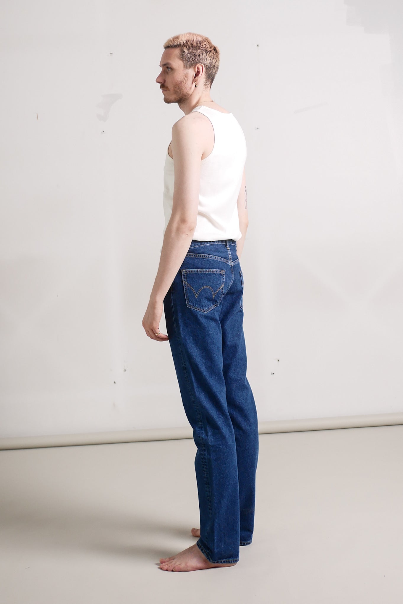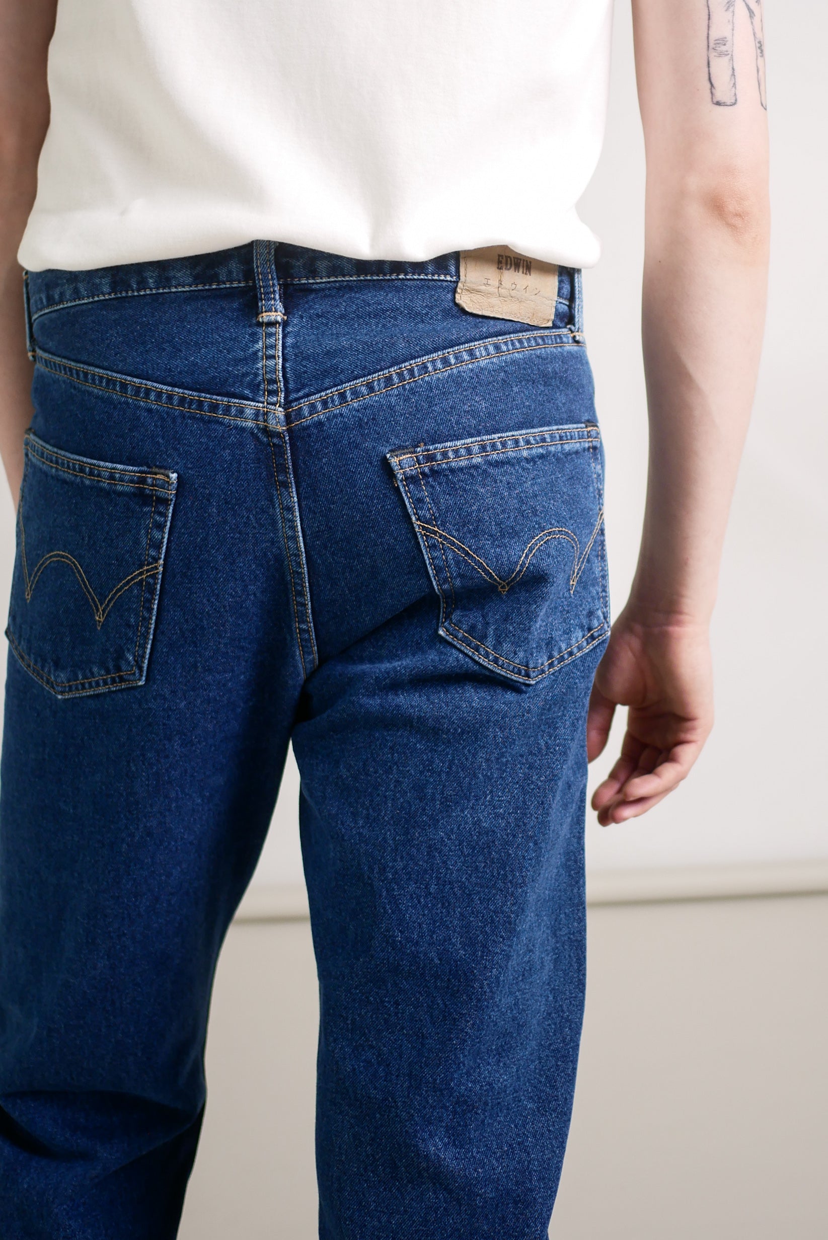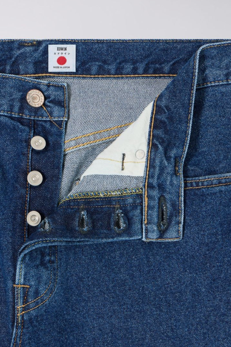 Edwinin suora farkkumalli klassisessa keskisinisessä pesussa. Farkuissa hieman väljä, suora puntti, korkea vyötärö sekä nappisepalus. Valmistettu 12,5-unssisesta Kaihara Pure Indigo opened -denimkankaasta.