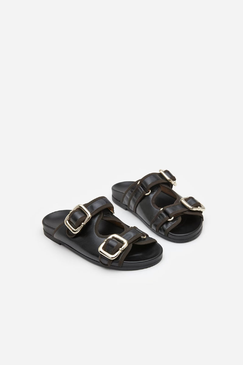 Minimalist sandals from the Swedish company Flattered. The sandals are made of smooth leather and are decorated with Flattered's own metal buckles. The shoe has a normal sizing.