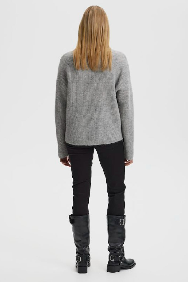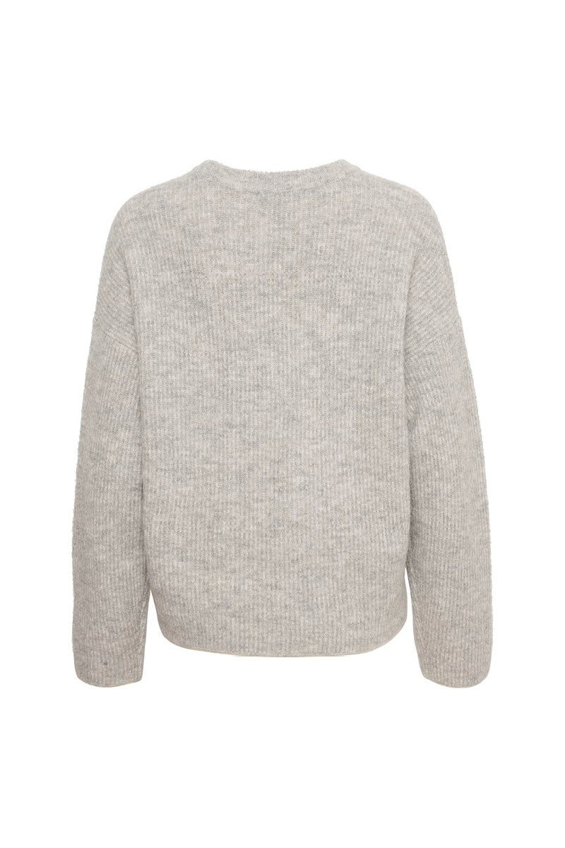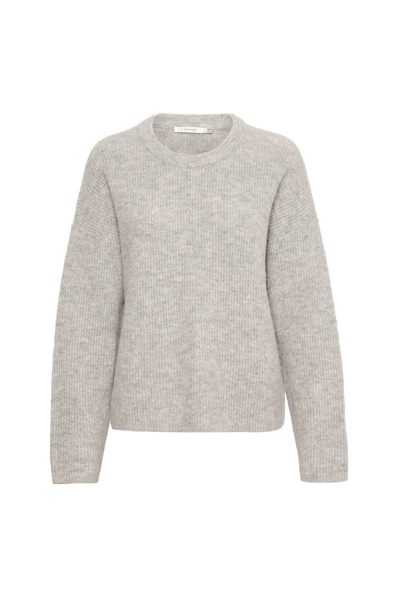 Upea neulepaita tanskalaiselta Gestuzilta. Monikäyttöinen vaaleanharmaa sävy pehmeästä alpakkasekoitteesta. Rento loose fit -malli tiputetuilla olkapäillä.