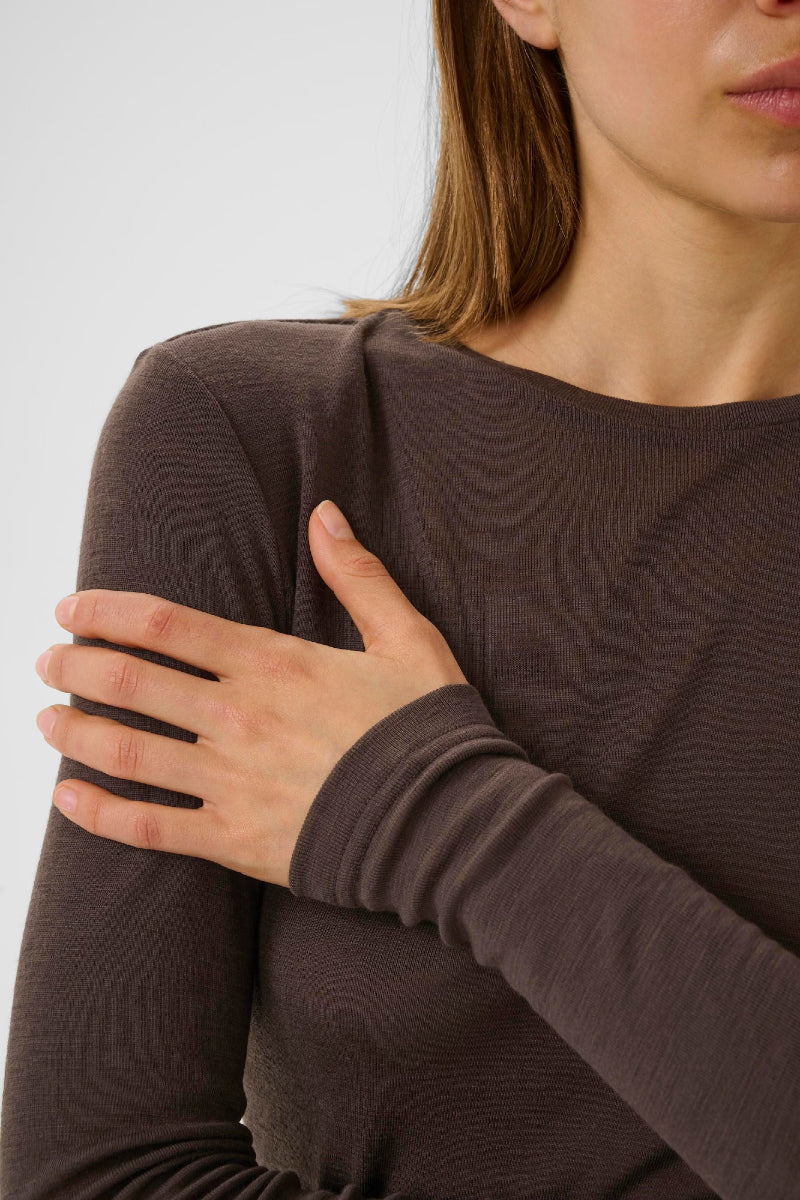 Gestuzin sataprosenttisesti villasta valmistettu pitkähihainen paita kauniissa tummanruskeassa sävyssä. Paita on kevyt ja hengittävä. Klassinen ja minimalistinen muotoilu tekee paidasta täydellisen arkeen ja se toimii niin yksinään kuin kerrospukeutumisessakin.