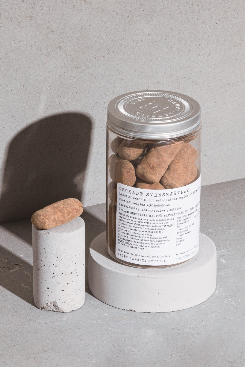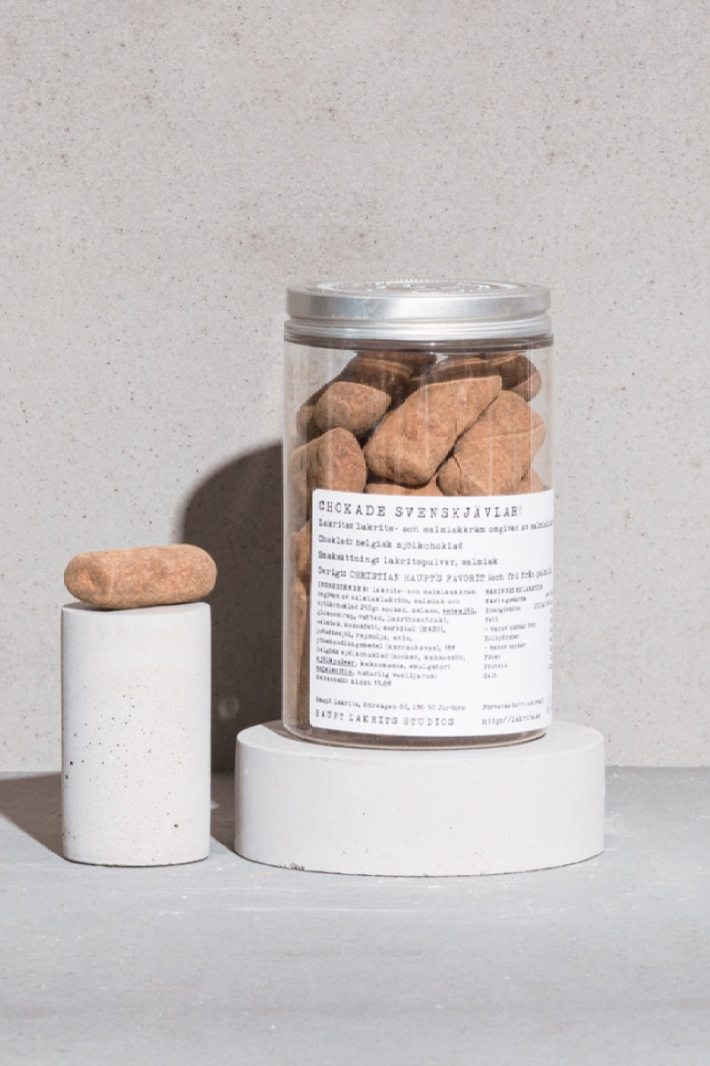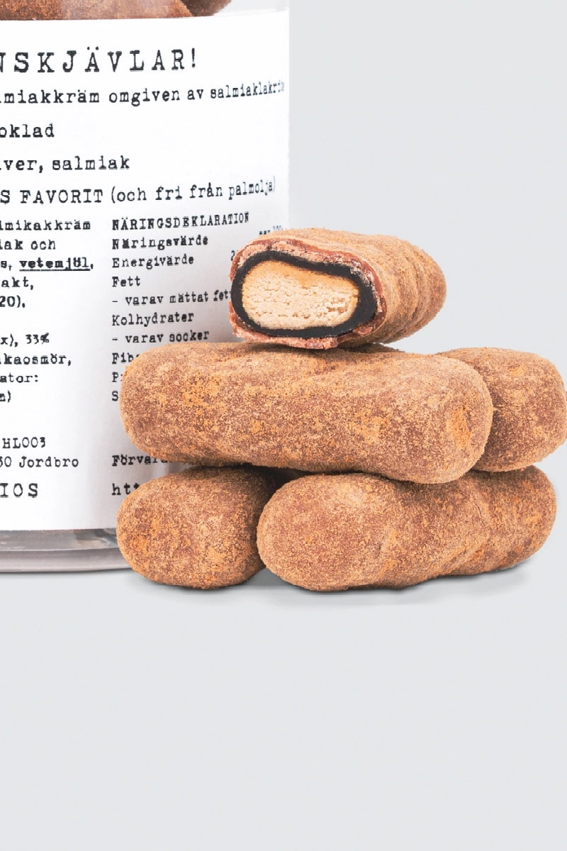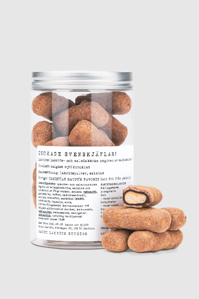Herkulliset ja lempeät Haupt Lakritsin Chokade Svenskjävlarit ovat belgialaisella maitosuklaalla kuorrutettua lakritsi- ja salmiakkikreemiä. Lopuksi nämä herkut on kieritelty lakritsijauheessa.