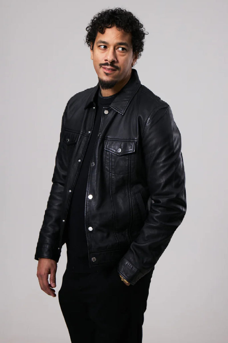 Miesten nahkatakki ruotsalaiselta Human Scalesilta. Takki on valmistettu mukavan pehmeästä lampaannahasta. Istuvuudeltaan takki on regular fit ja sitä voi käyttää mainiosti myös lisäkerroksena t-paidan päälle puettuna. Sisävuori on tummansinistä satiinia ja yksityiskohdat ovat hopean värisiä.