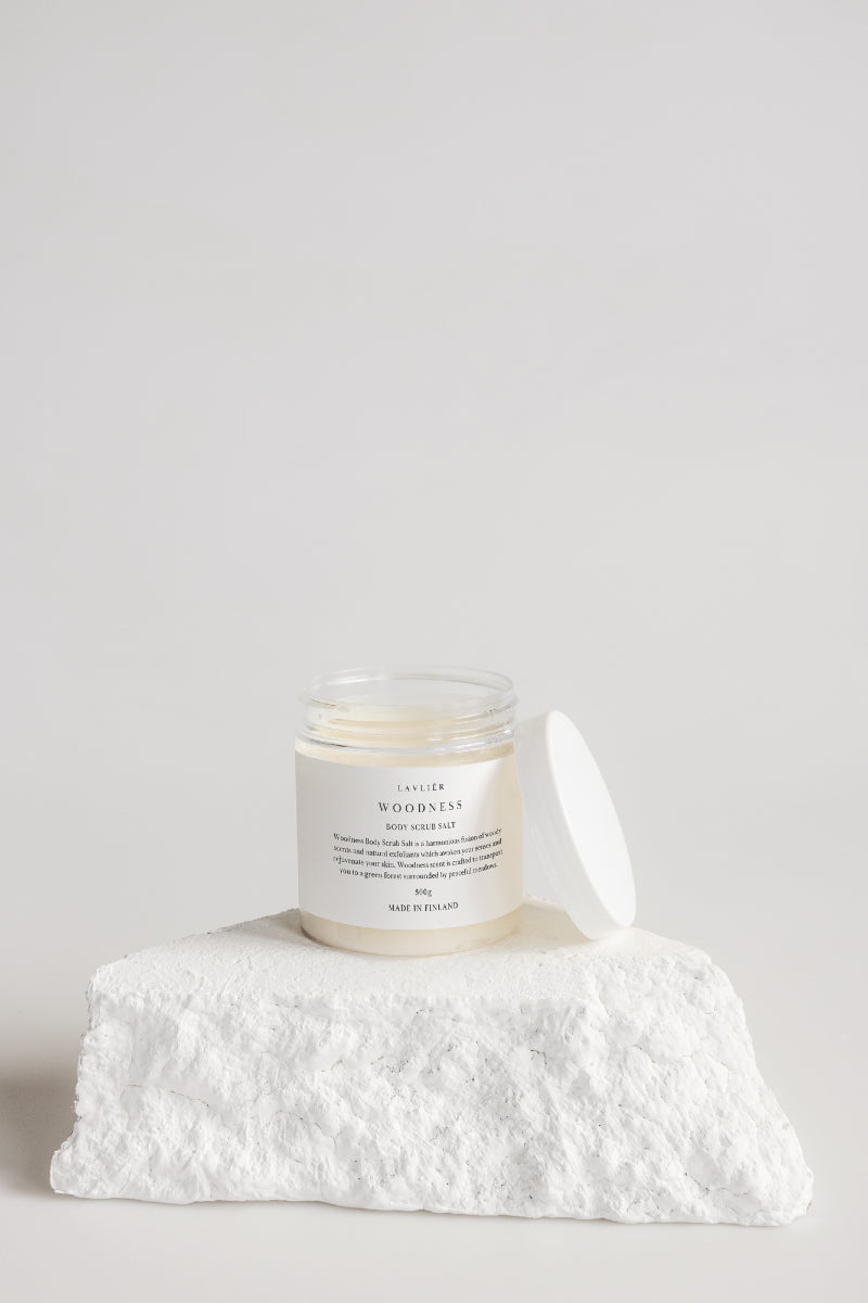 Lavliér Woodness -vartalokuorintasuolan tyylikäs pakkaus tuo kylpyhuoneeseen ripauksen hienostuneisuutta.