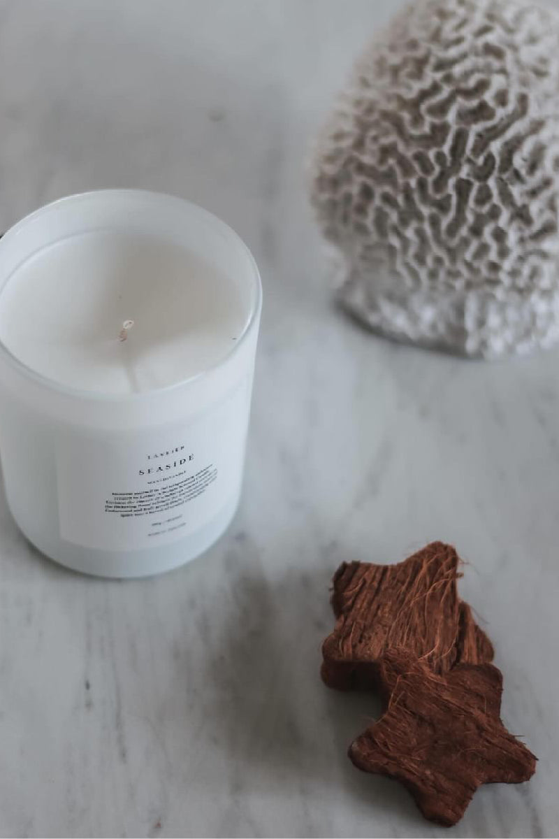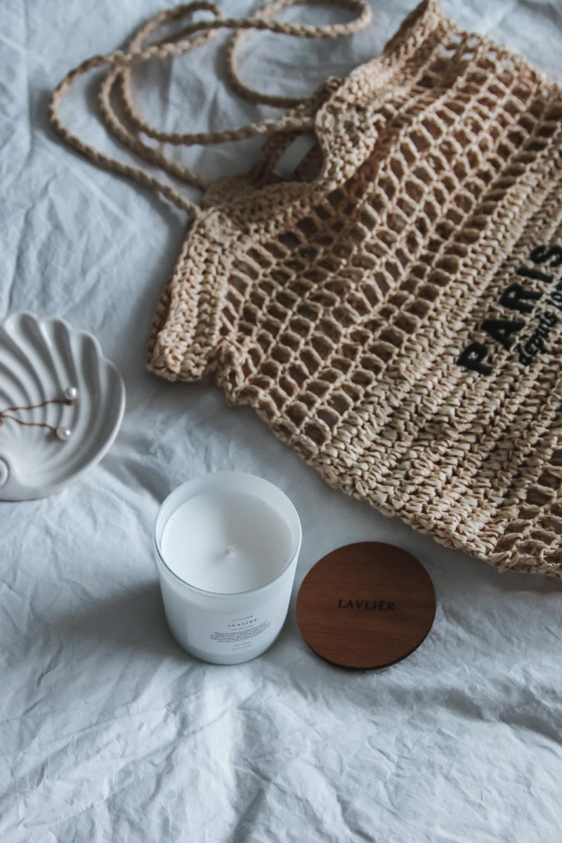 Lavliér Seaside tuoksukynttilän kaunis ja esteettinen mattavalkoinen lasi täydentää kokonaisuutta joka tuo tilaasi rannikon rauhallisuutta.