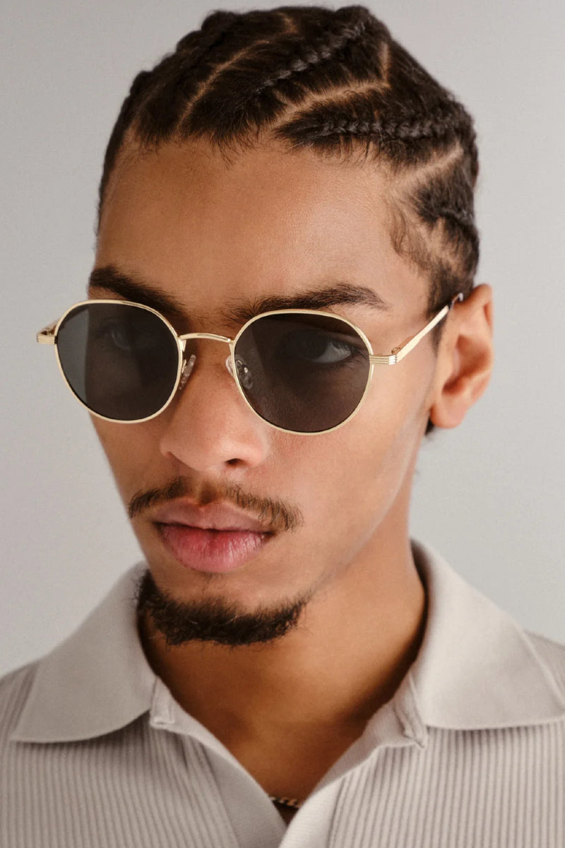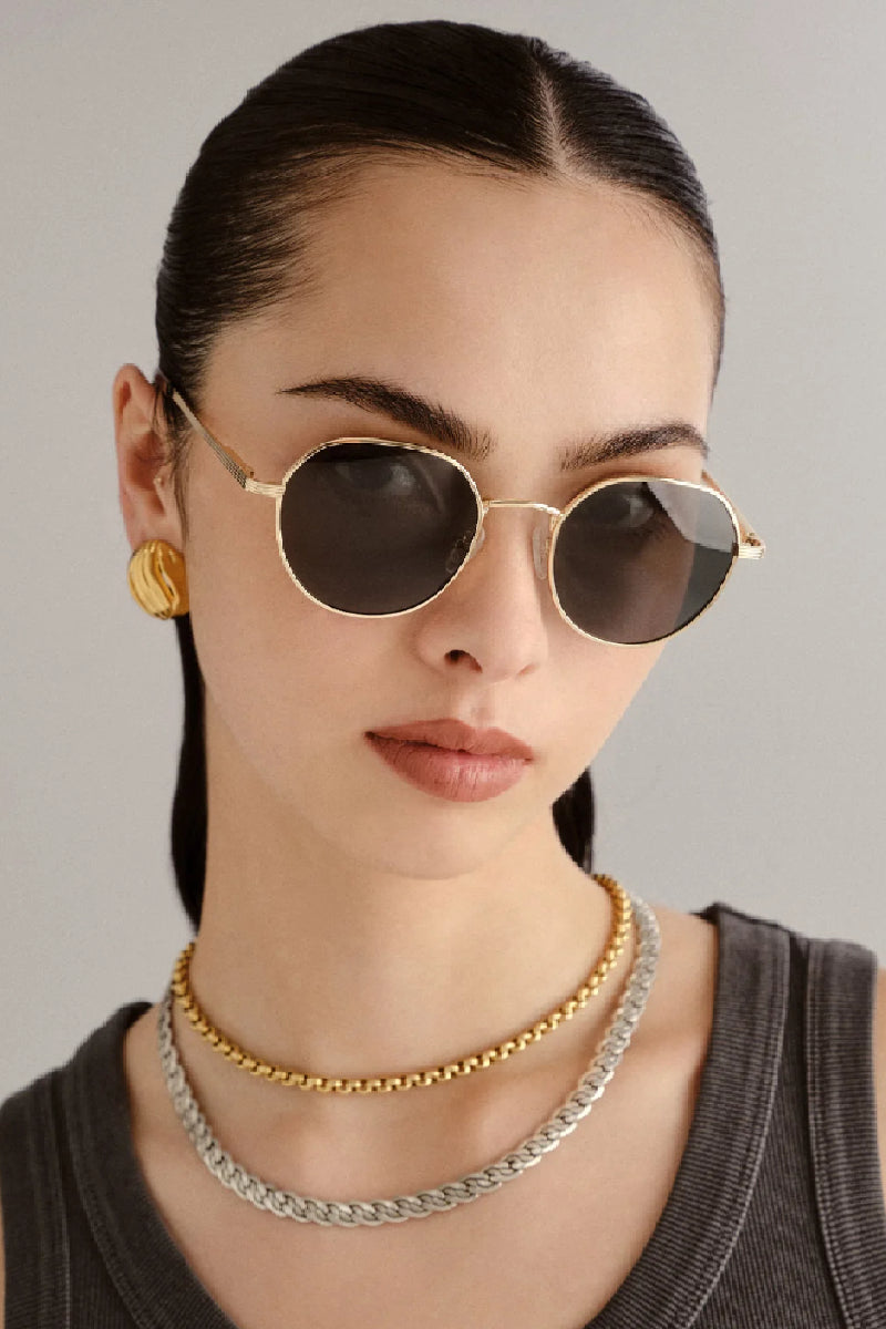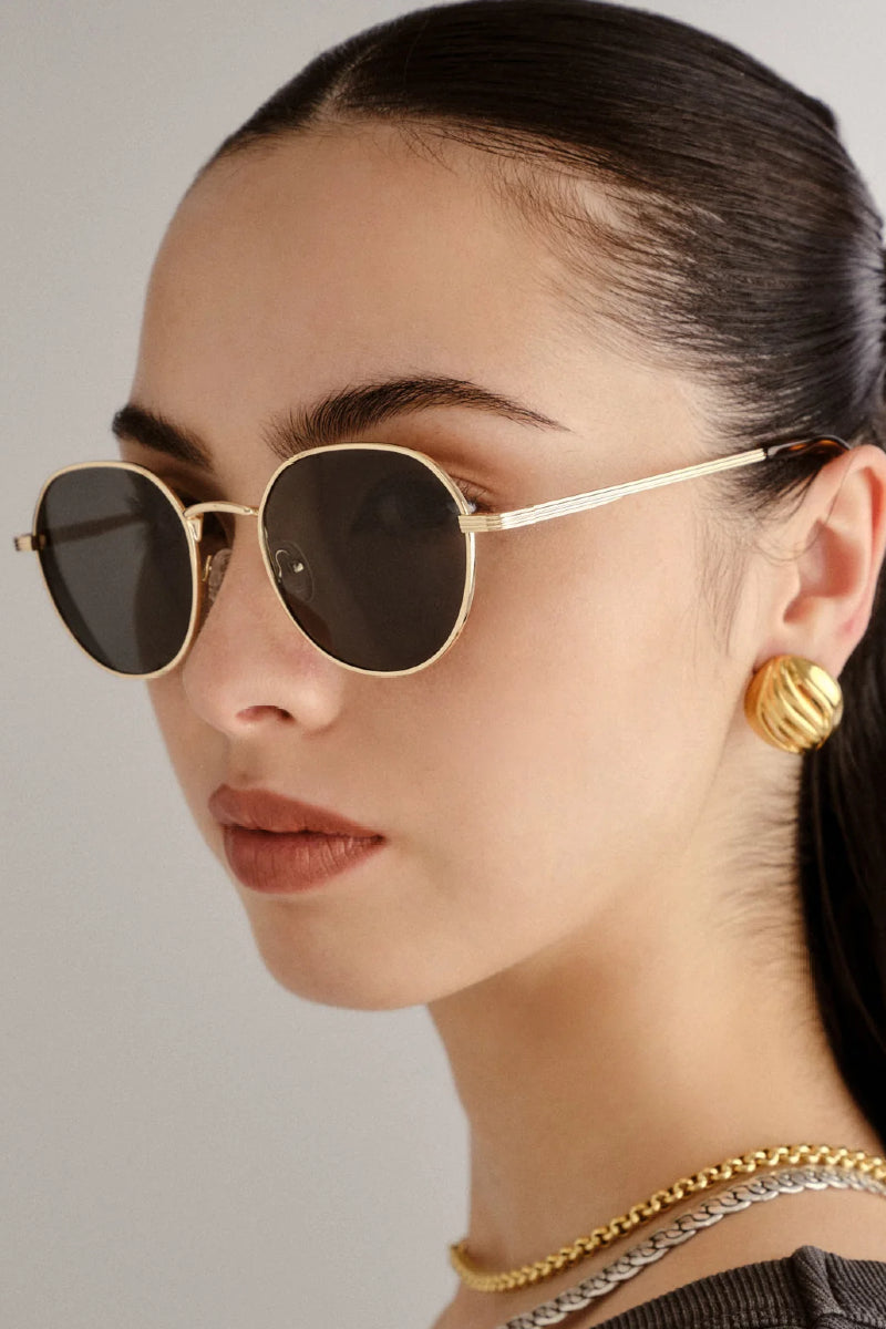 Minimalistinen ja ajaton aurinkolasimalli kauniilla kultaisella kehyksellä. Laseissa klassiset pyöreät linssit sekä raitayksityiskohdat sangoissa jotka tuovat kehyksiin modernin ilmeen. Tämä unisex-malli on keskikokoinen ja sopii monille kasvonmuodoille.