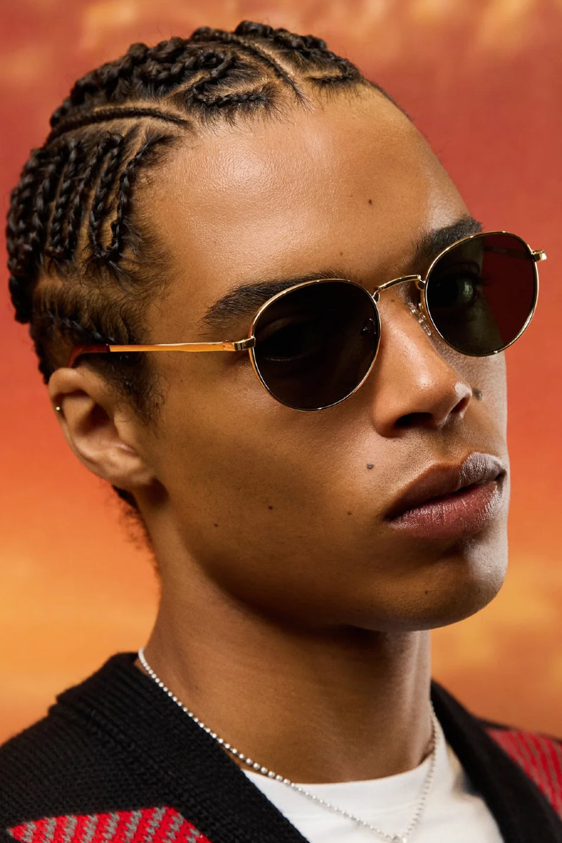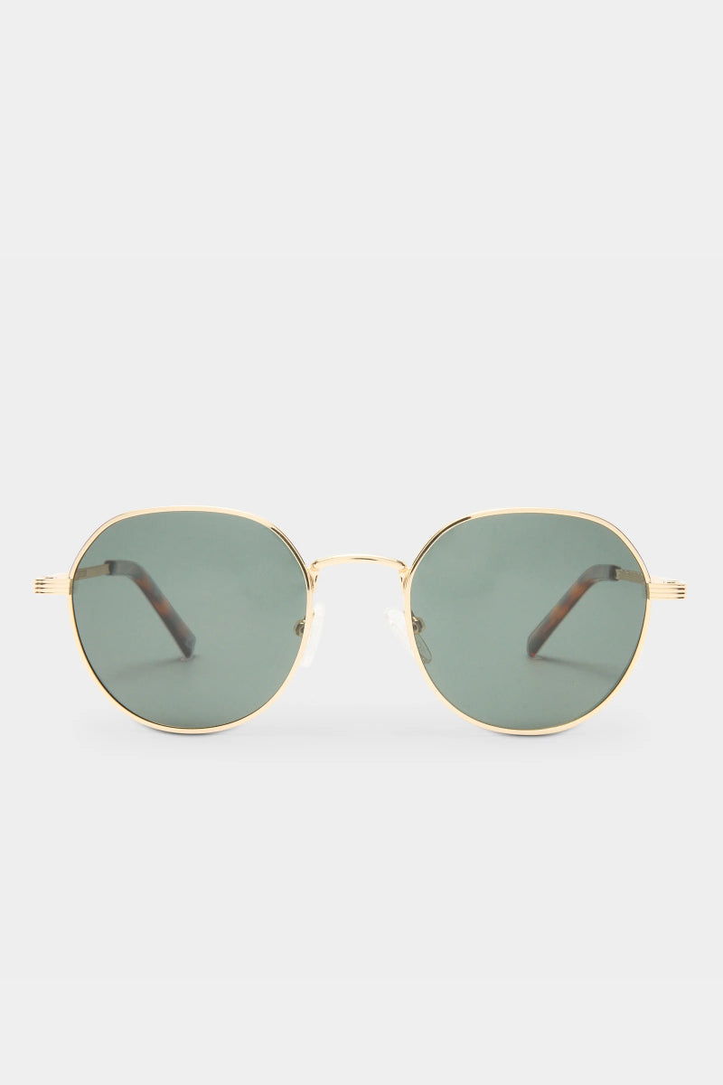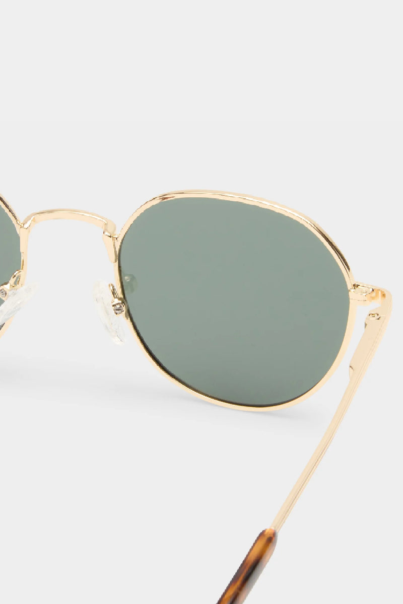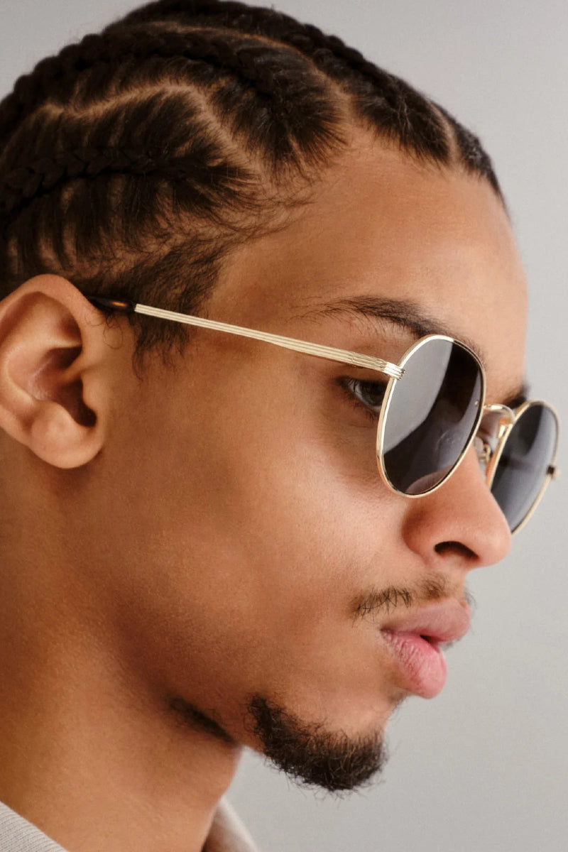 Minimalistinen ja ajaton aurinkolasimalli kauniilla kultaisella kehyksellä. Laseissa klassiset pyöreät linssit sekä raitayksityiskohdat sangoissa jotka tuovat kehyksiin modernin ilmeen. Tämä unisex-malli on keskikokoinen ja sopii monille kasvonmuodoille.