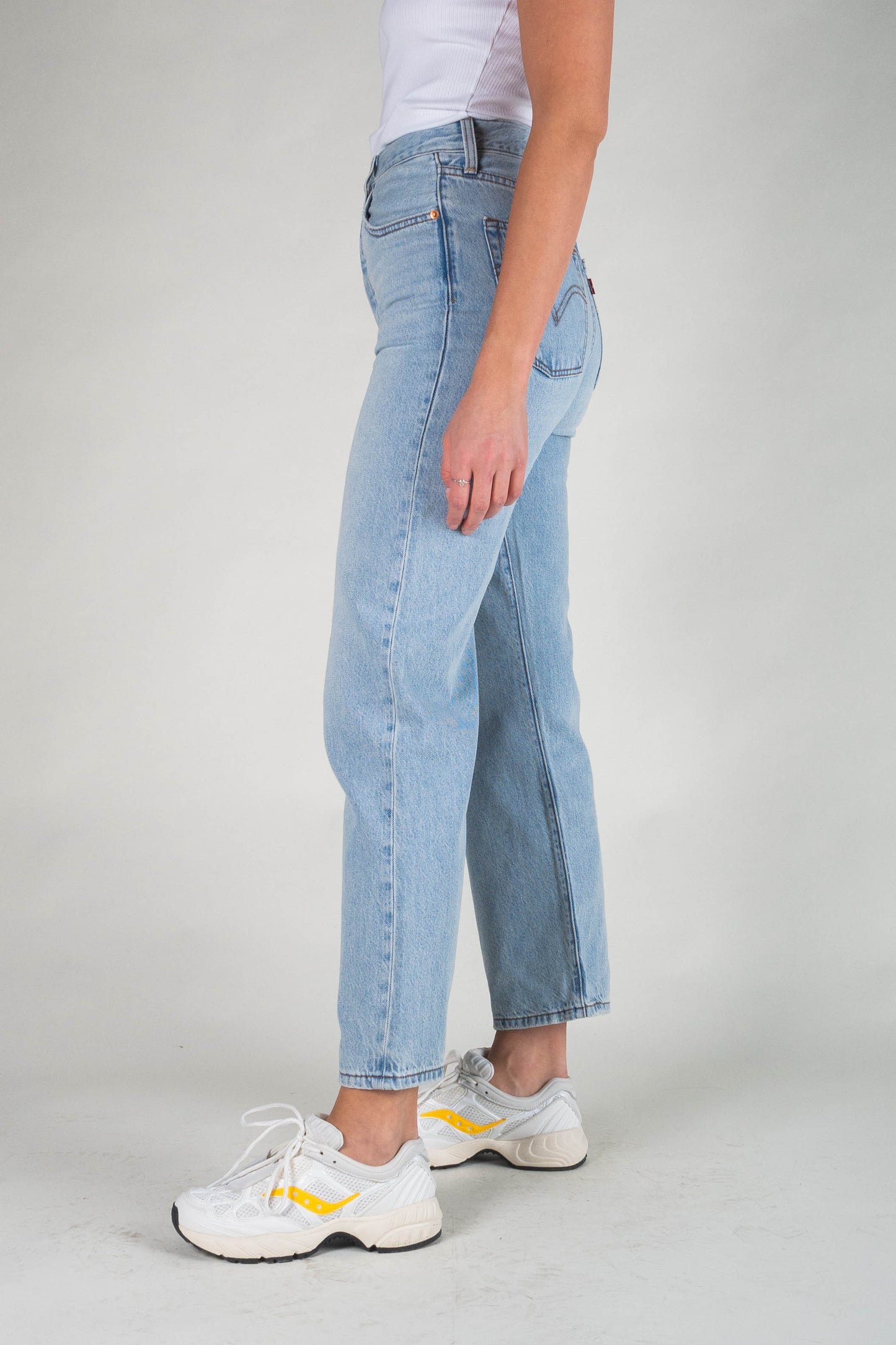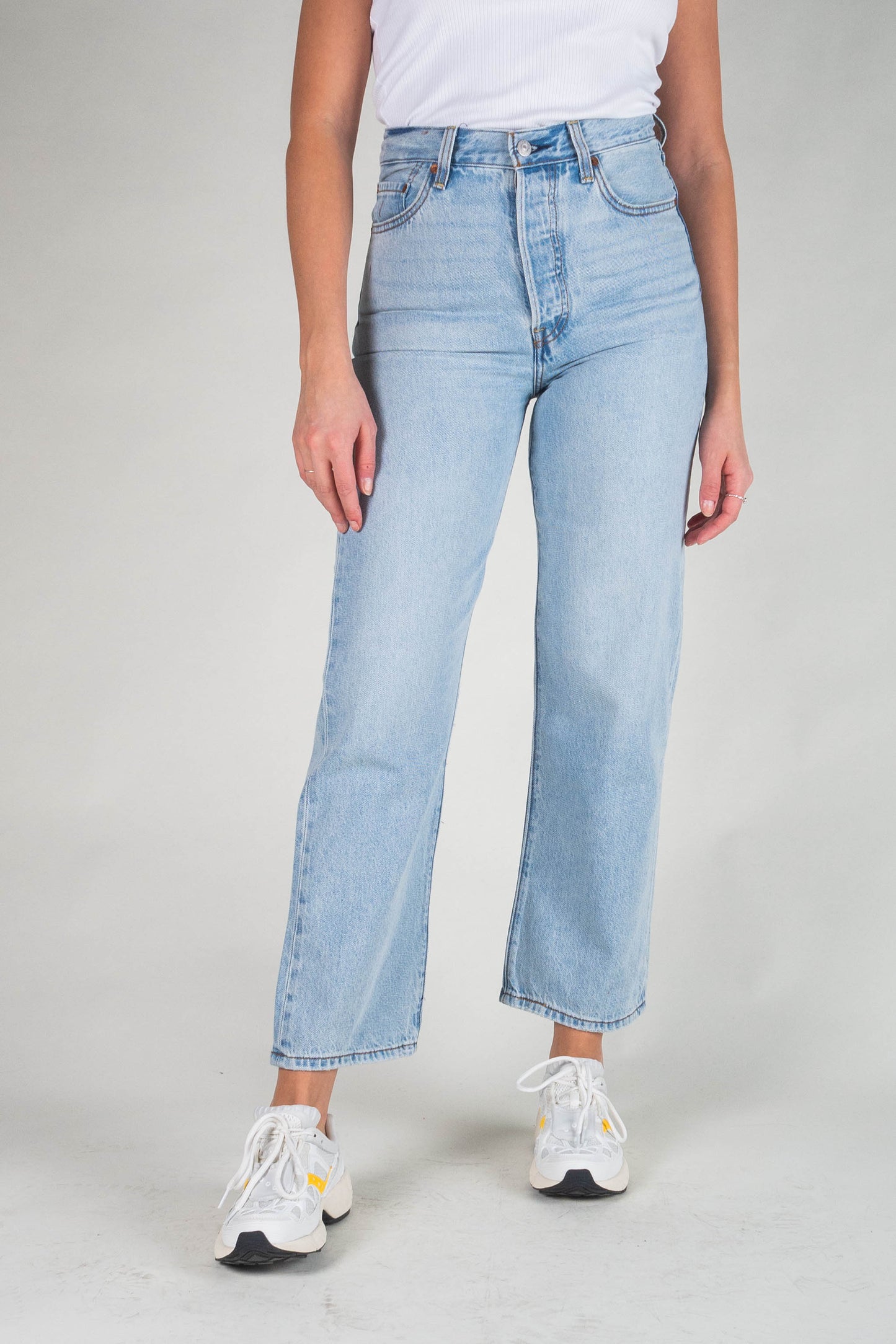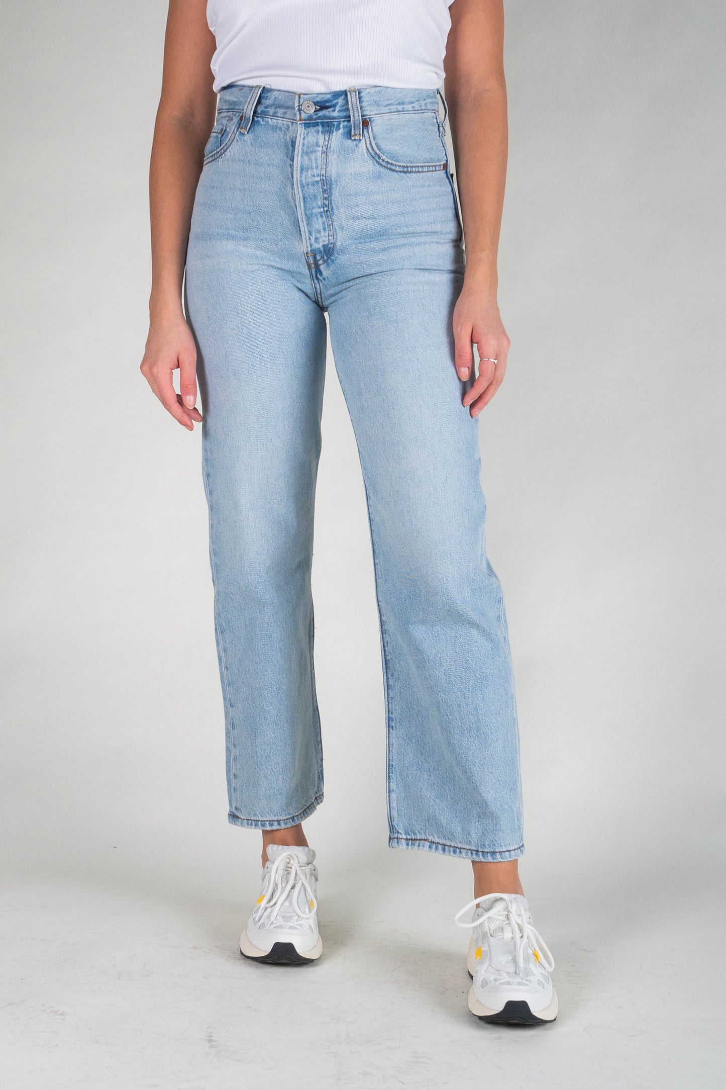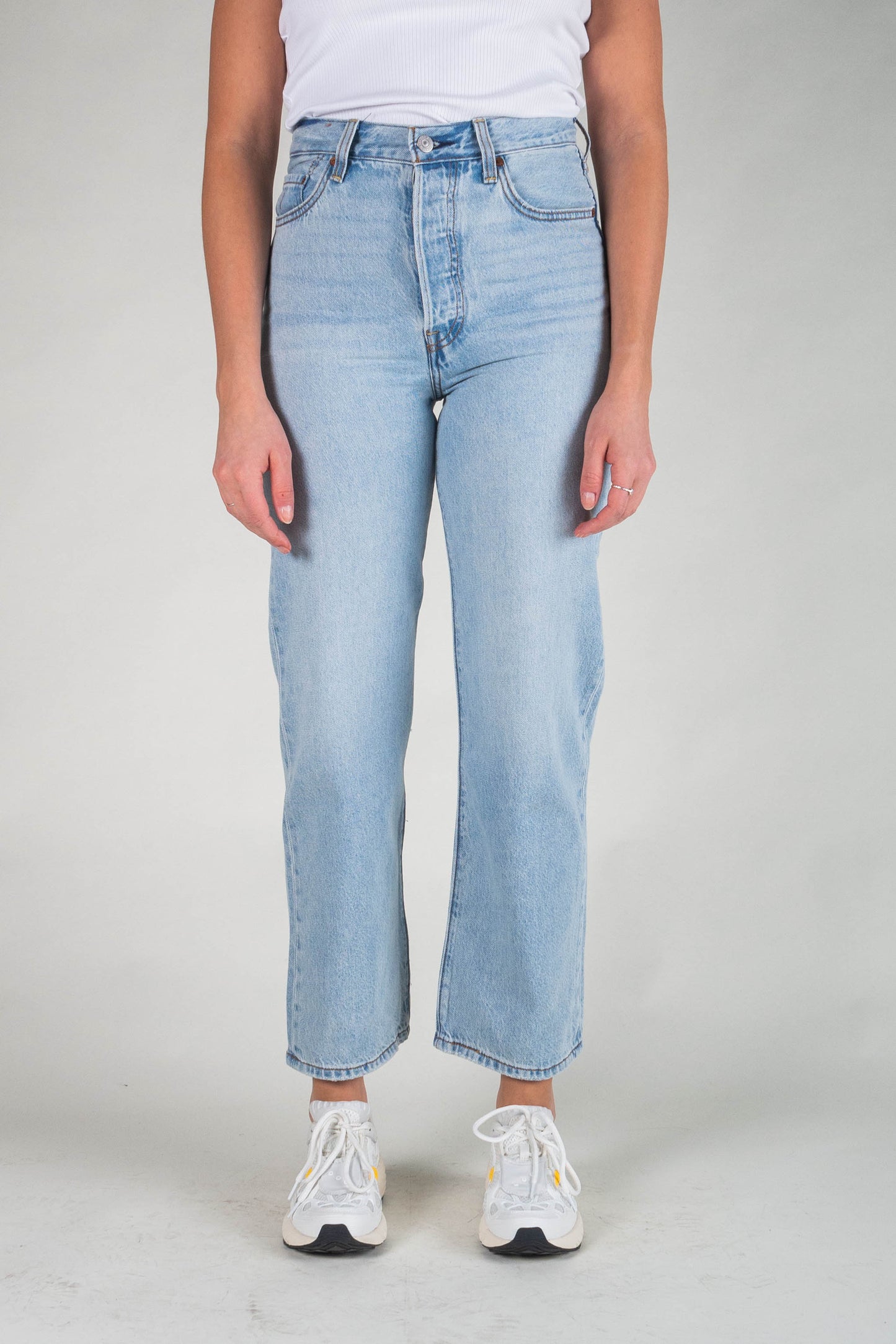 The highest-waisted jeans from Levis. The model fits well on the hips. The legs are straight and ankle length. Fabric made of a pleasantly soft cotton blend that stretches a little. A beautiful and fresh light blue wash.