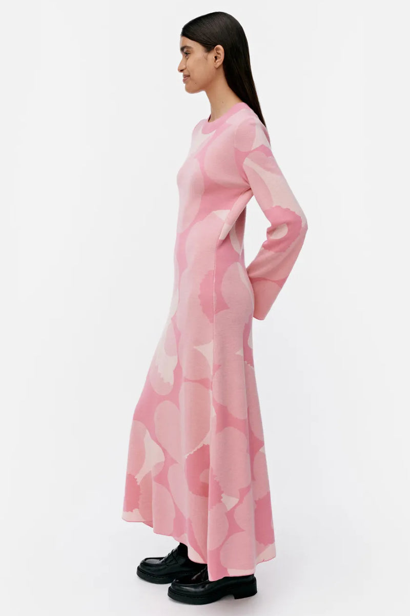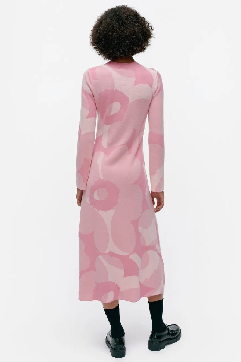 Leikkuu-neulemekko on valmistettu merinovilla-viskoosisekoitteesta ja siinä on niukka istuvuus, suoraksi leikattu yläosa ja alaspäin levenevä helma. Mekossa on jacquard-kudottu Unikko-kuosi, resori pyöreässä pääntiessä ja pitkät, hieman trumpettimaiset hihat.