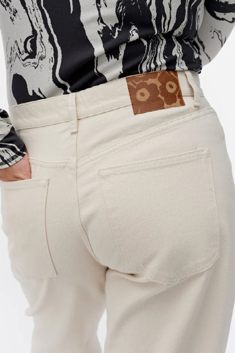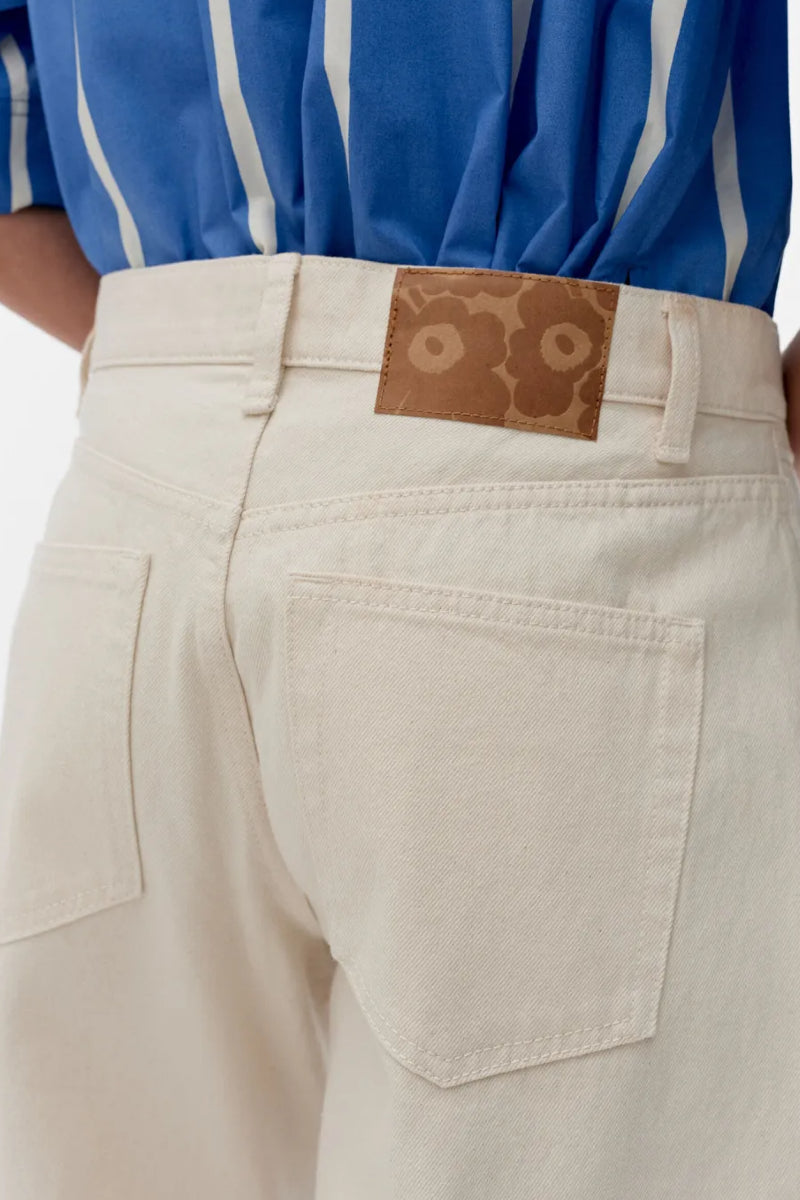 Luonnonvalkoiset Maridenim Barrel -farkut on valmistettu puuvillakankaasta, joka ei sisällä elastaania. Farkut ovat 5-taskumallia ja niissä on normaali vyötärö, rento istuvuus ja vajaamittaiset lahkeet, joissa on pyöristetty leikkaus. Farkuissa on Marimekko-farkkunapit ja Marimekko-farkkumerkki takana, joka on valmistettu FSC-sertifioidusta jacron-materiaalista.
