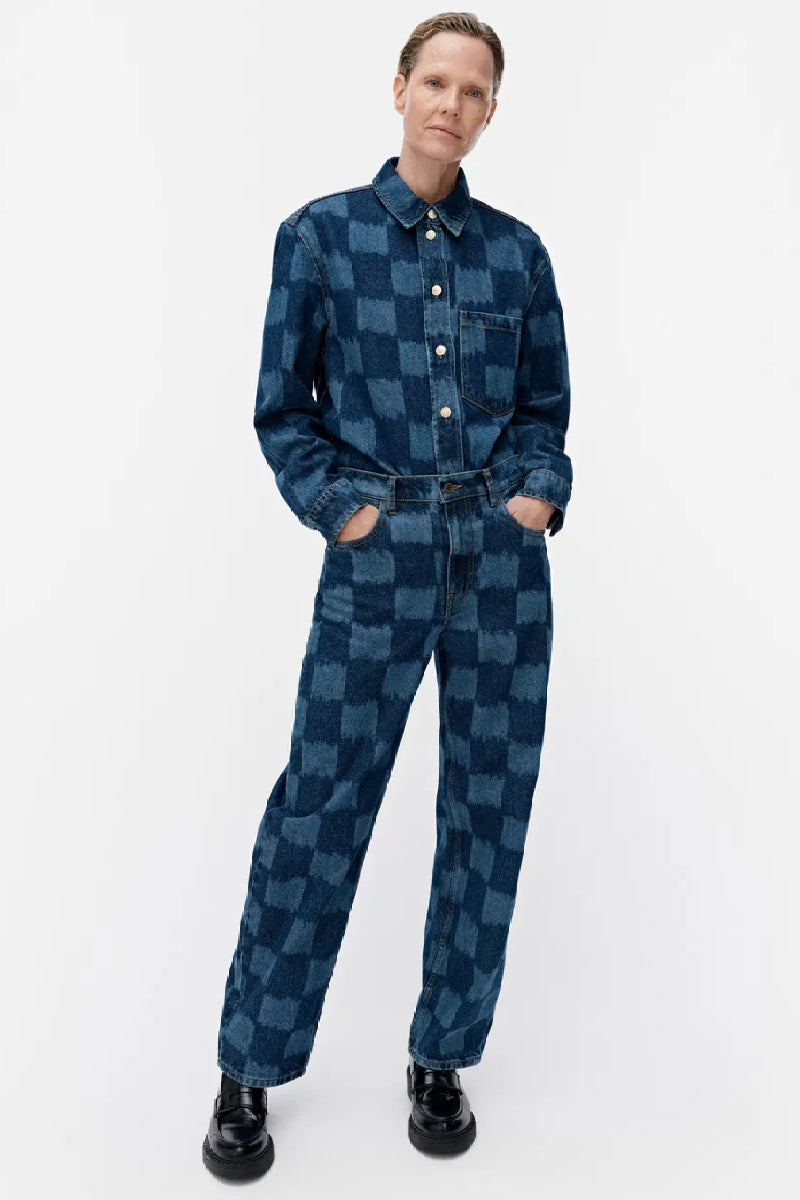 Jokapaikan farkuissa on normaali vyötärö ja rento istuvuus. Vajaamittaiset, nilkkaa kohti kapenevat lahkeet. Saatavilla sininen, syvän musta sekä ikoninen Unikko – yhteensopiva farkkupaita viimeistelee asun.