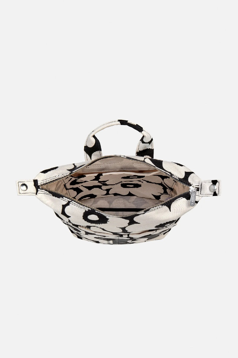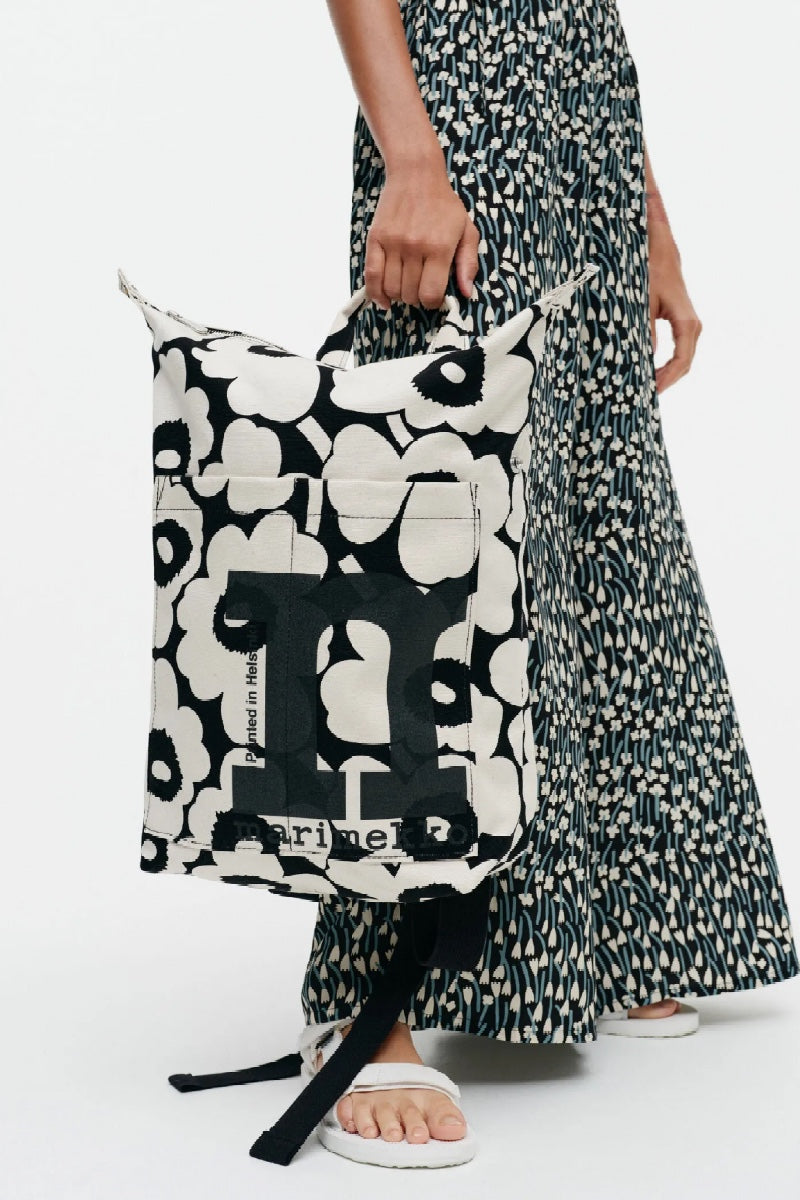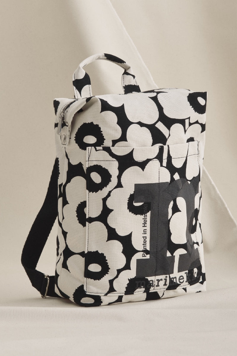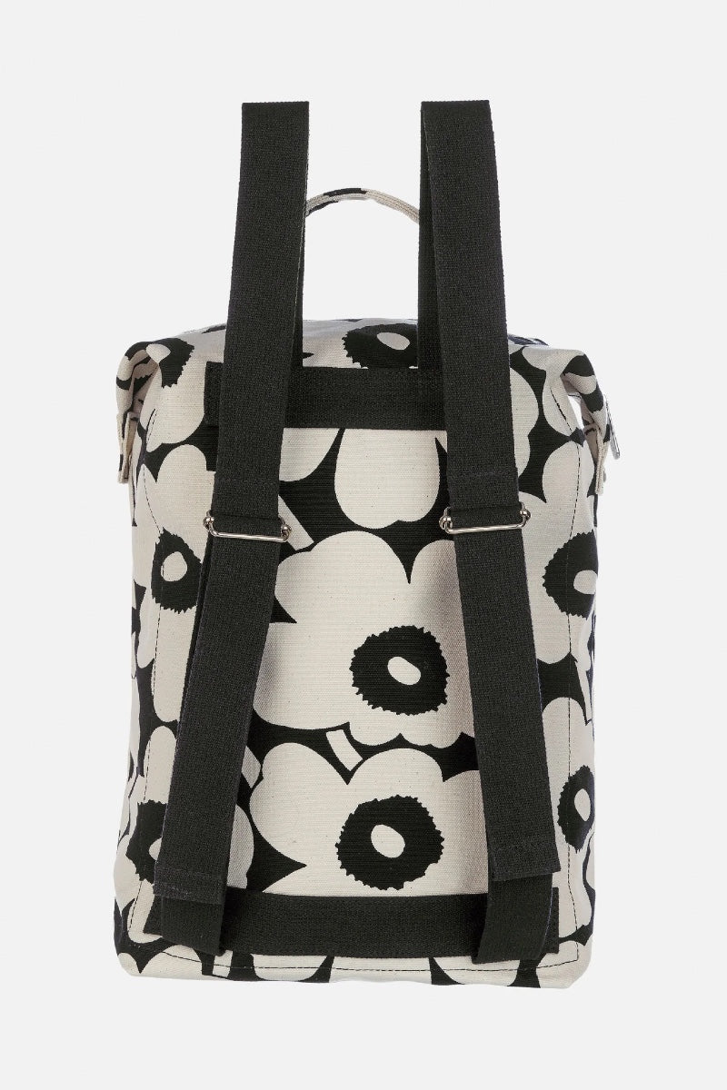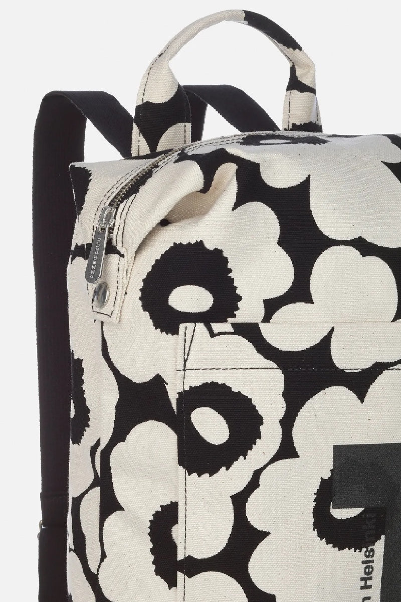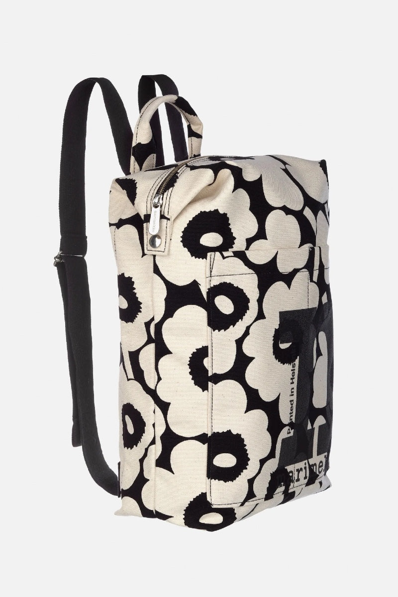 Marimekon Unikko-kuosinen Mono Backpack -reppu on valmistettu valkaisemattomasta luomupuuvillasta, joka on painettu Helsingissä. Repussa on vetoketjusuljenta, säädettävät olkahihnat ja kaksiosainen avoin ulkotasku etupuolella. Sisäpuolella on yksi iso avoin tasku esimerkiksi kannettavaa tietokonetta varten. Vetoketjun päät saa kiinnitettyä repun sivuihin painonapeilla.