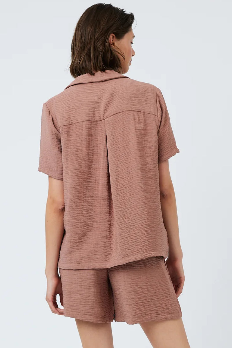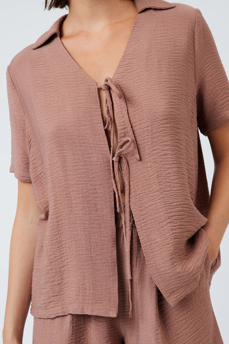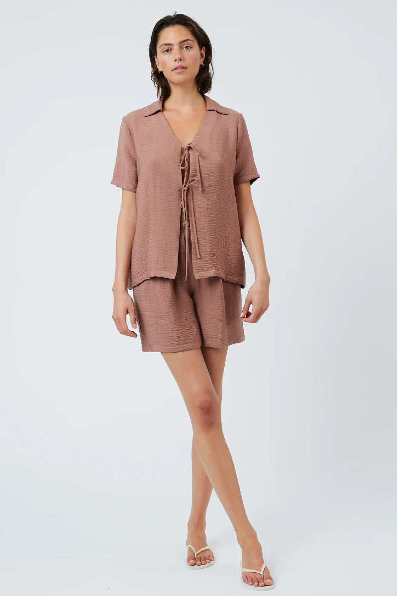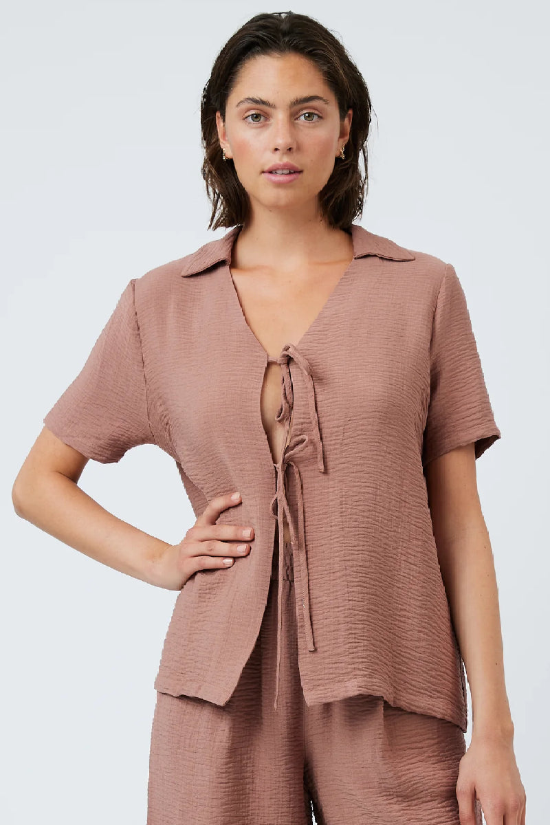 Ihanan pehmeästä ja tekstuurisesta viskoosista valmistettu paita Minimumilta. Rento istuvuus, lyhyet hihat ja kaulukset. Yksityiskohtana nauhat edessä, jolla paitaa saa muokattua haluamaansa istuvuuteen. Yhdistä yhteensopivien Ditas-shortsien kanssa.