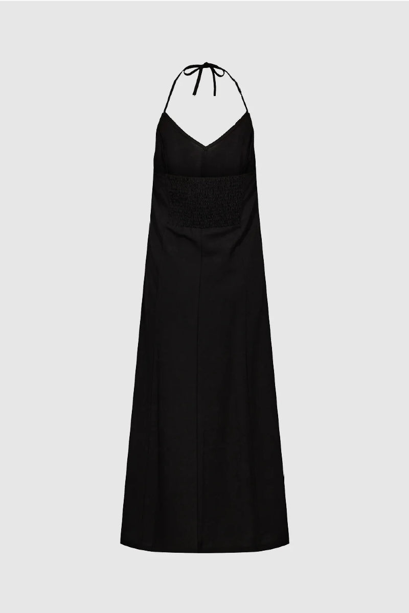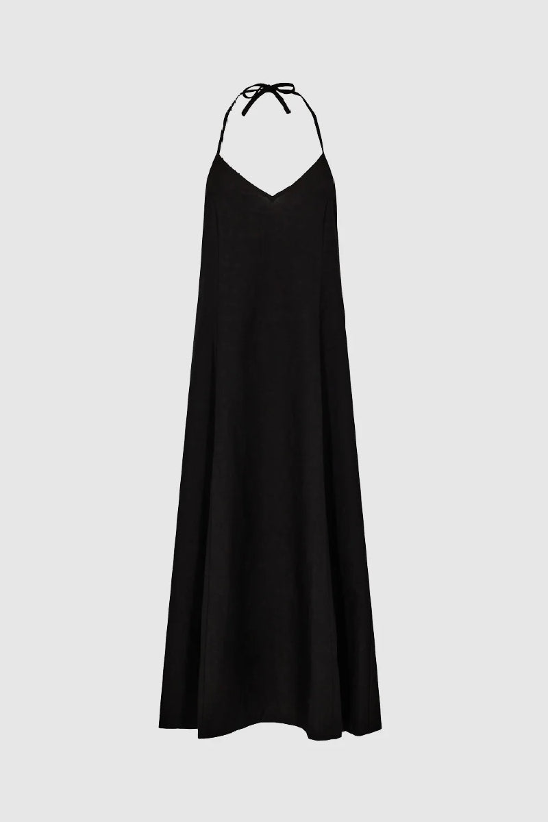 Ihanasta pellavaviskoosisekoitteesta valmistettu midimekko Minimumilta. Materiaali on täydellinen kesään, hengittävä ja vilpoisa. Mekossa on väljä istuvuus ja halterneck yläosa. Selkäosa laskeutuu viehkeästi alas ja joustaa mukavasti päällä.