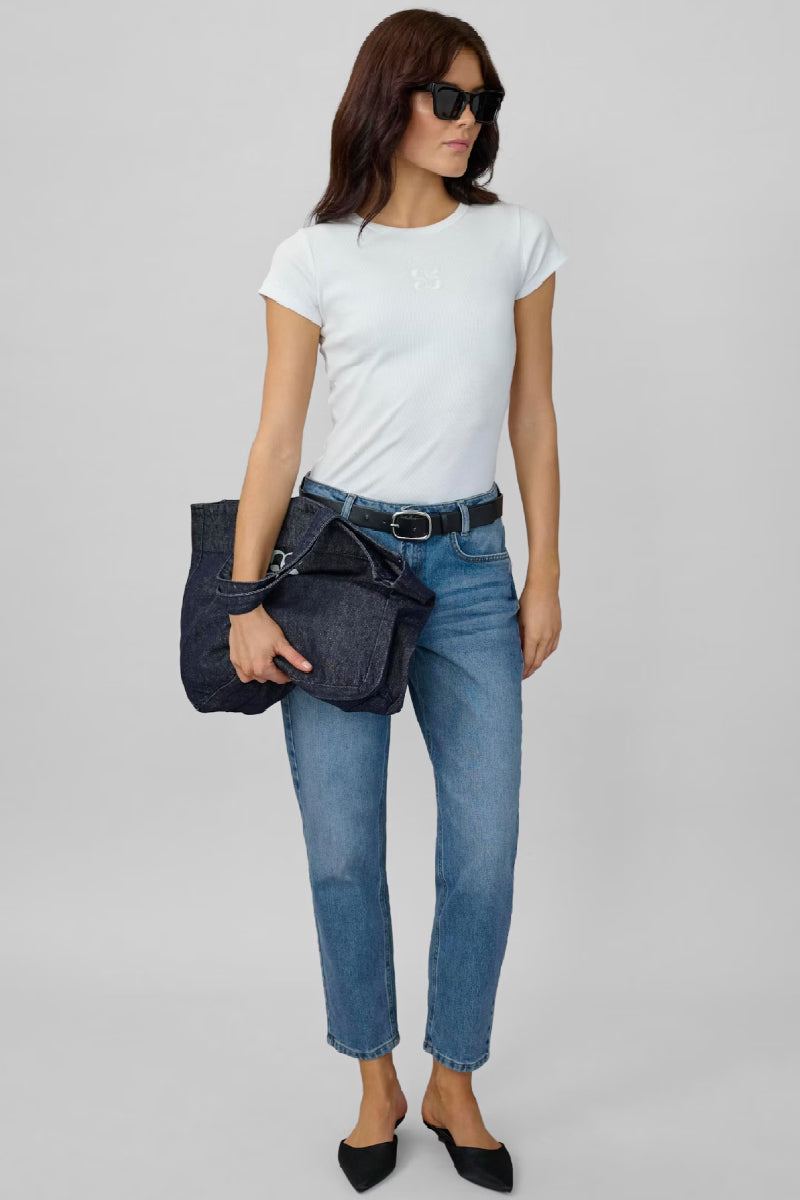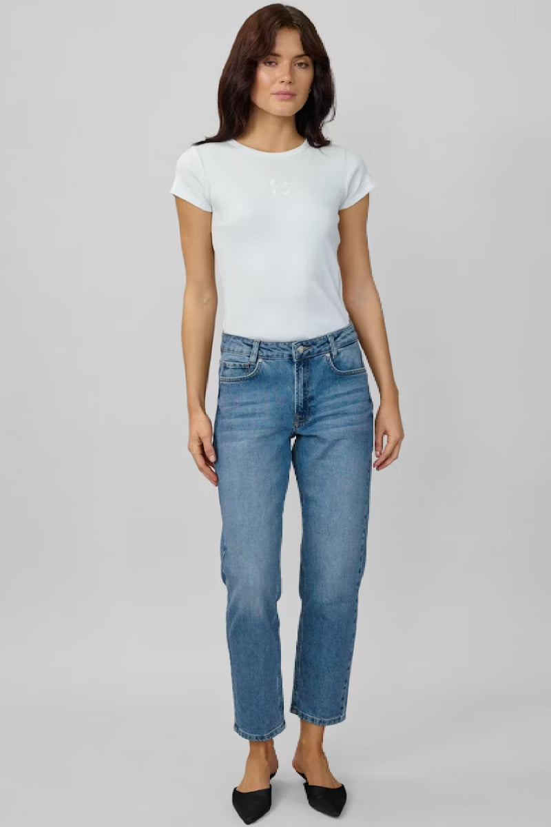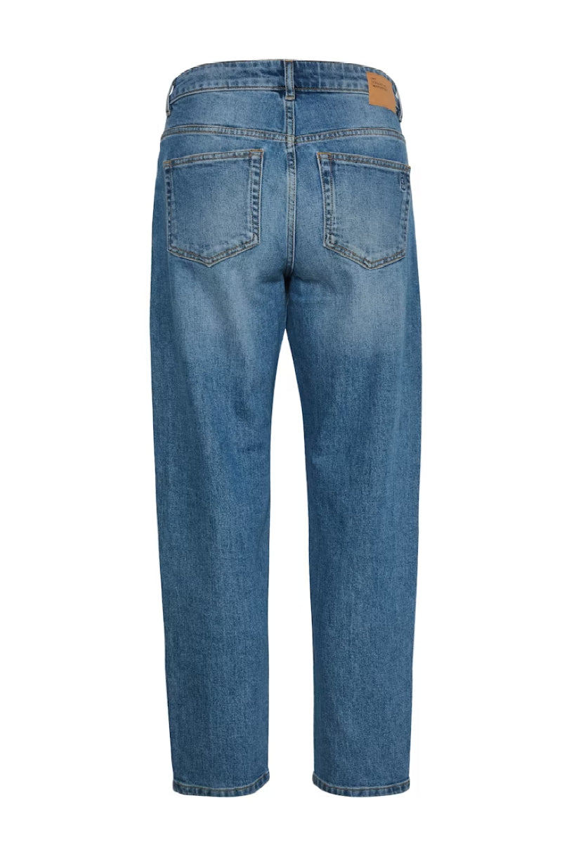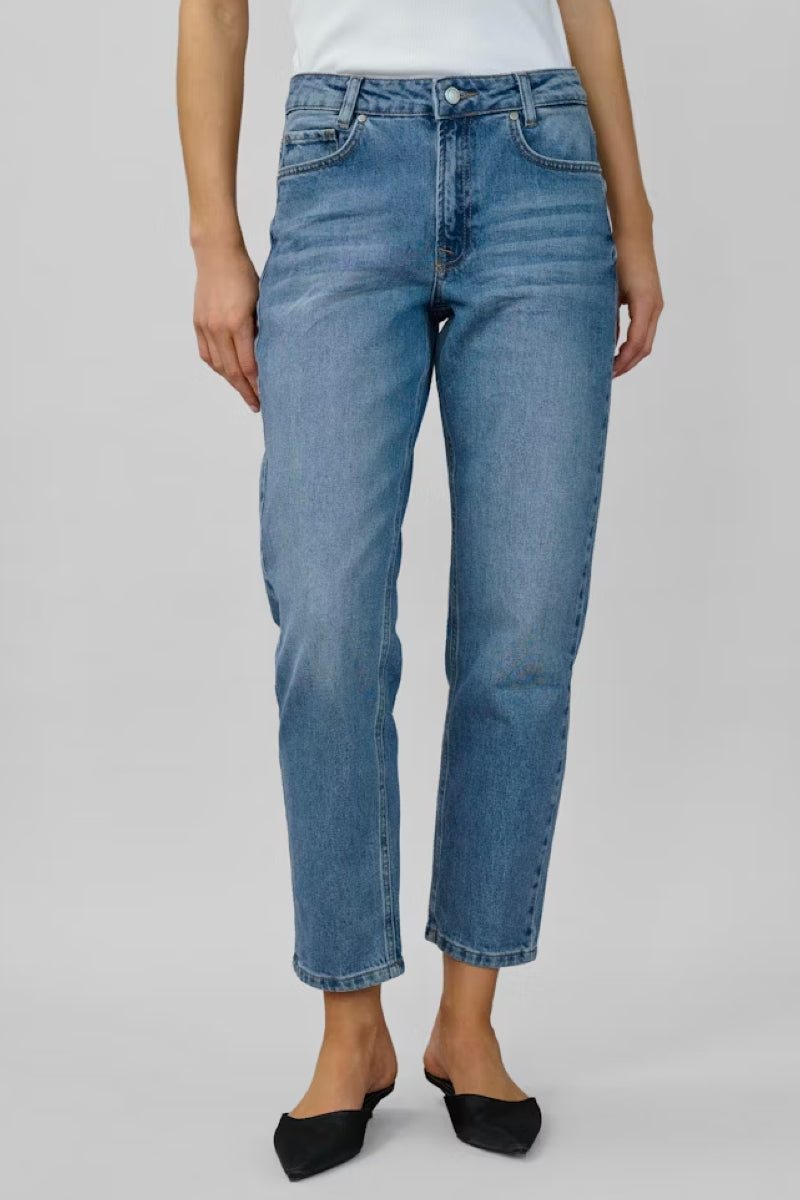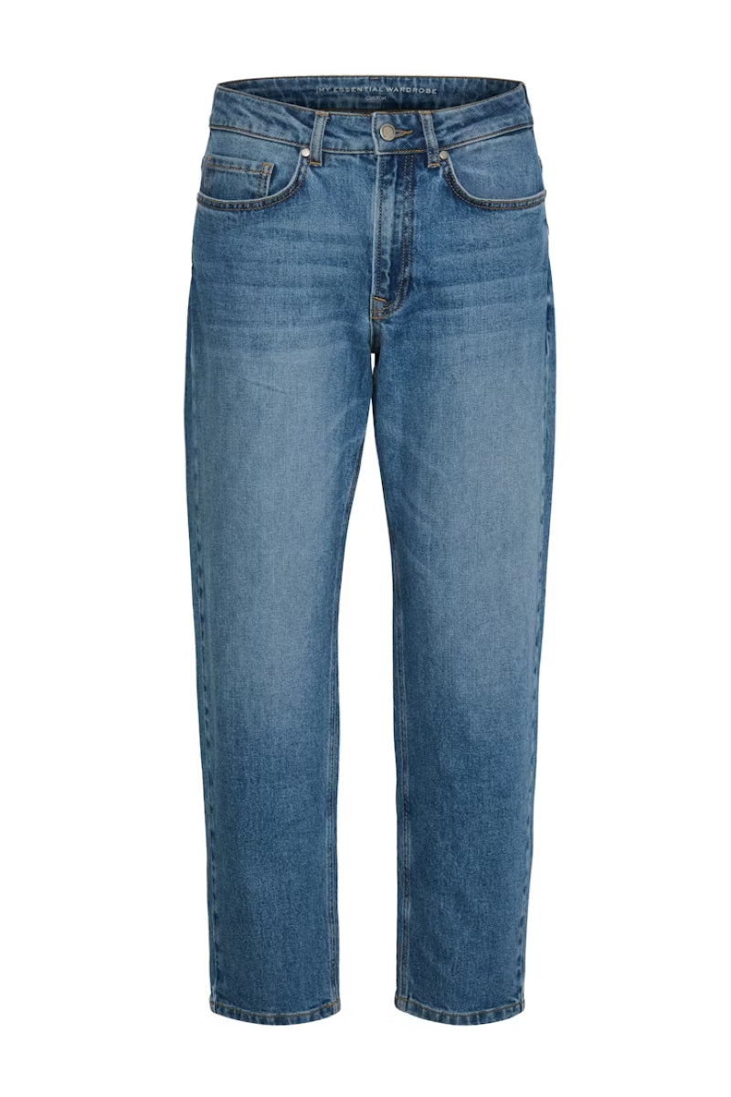 Klassiset 5-taskumalliset farkut tanskalaiselta My Essential Wardrobelta. Farkuissa rento 'mom jeans' -malli, keskikorkea vyötärö sekä cropattu lahje joka kapenee maltillisesti nilkkaa kohden. Vintagetyylinen keskisininen pesu ja hopeiset rivetit viimeistelevät kokonaisuuden. Materiaalina pehmeä ja joustava puuvilladenim.