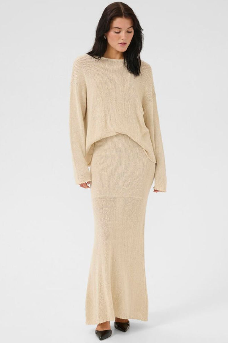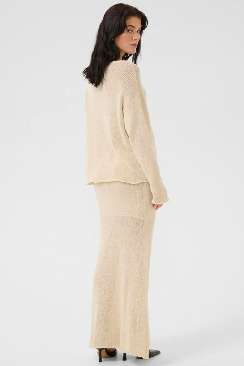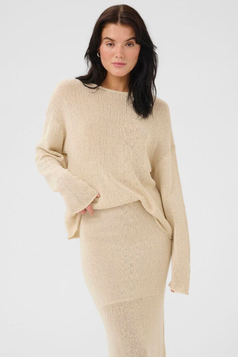 Kevyt vaalea neulepaita rennolla siluetilla, lasketuilla olkapäillä ja klassisella o-pääntiellä. Hengittävä verkkomainen neulos tekee paidasta mukavan ja monikäyttöisen erityisesti lämpimiin vuodenaikoihin. Neuleessa hieman epäsymmetrinen, aaltoileva helma, joka tuo ilmeeseen huolettoman ja modernin vivahteen.