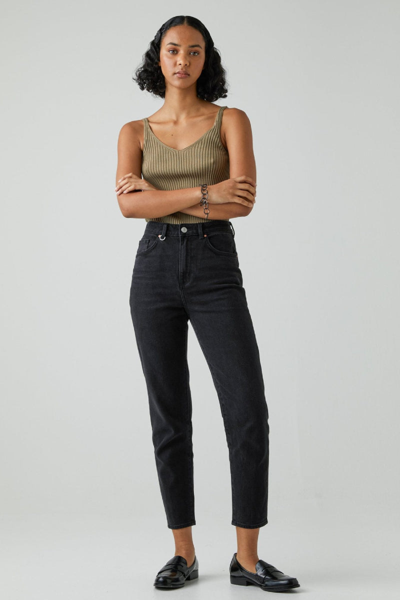 High-waisted women's denim jeans. Wash, fine worn black. The jeans sit flatteringly at the waist and the leg slightly widens from the knee down. Finished with Neuw's iconic details.