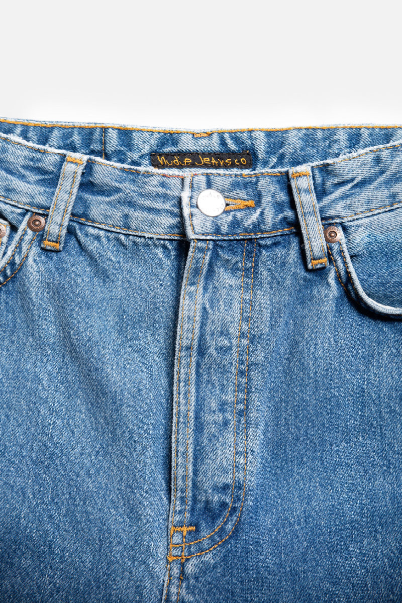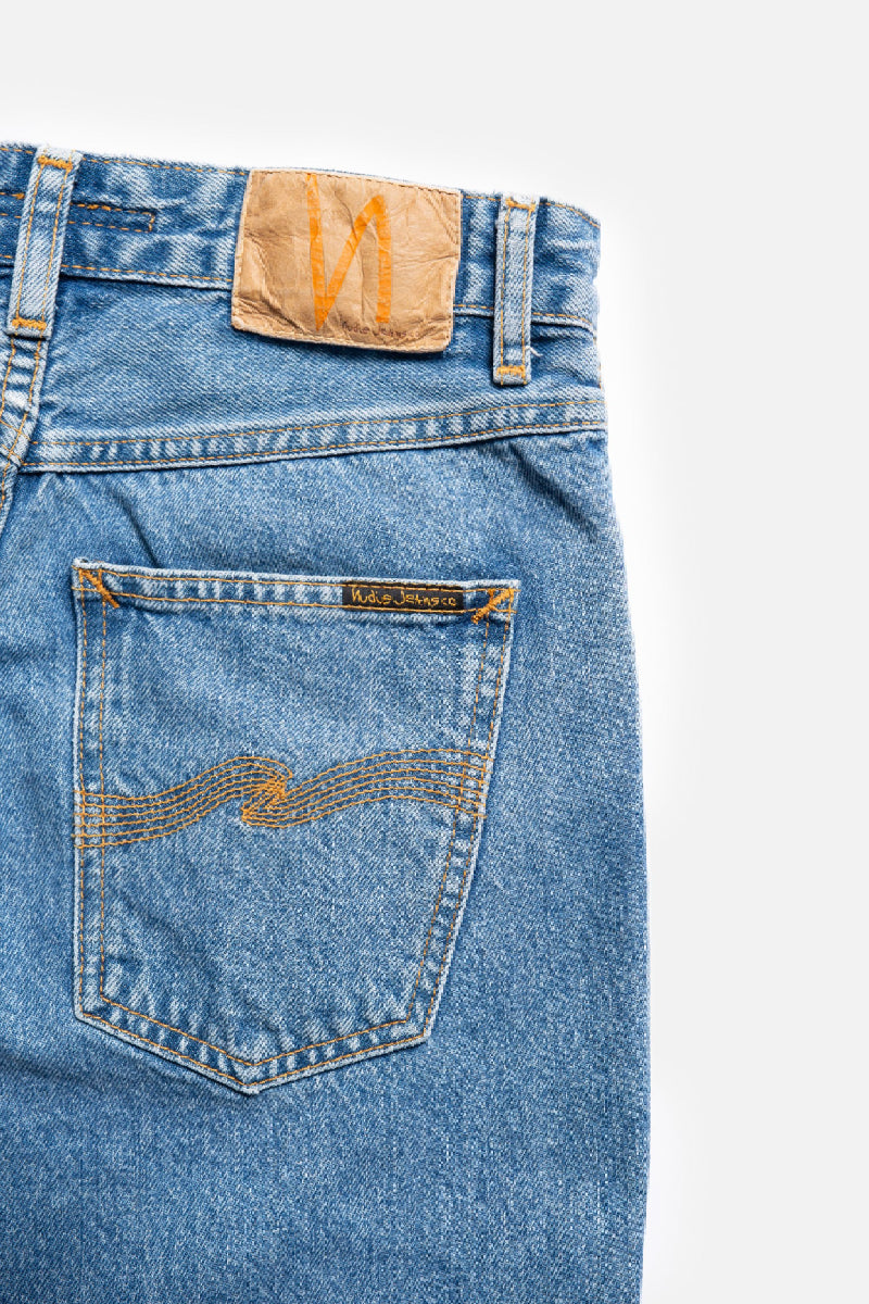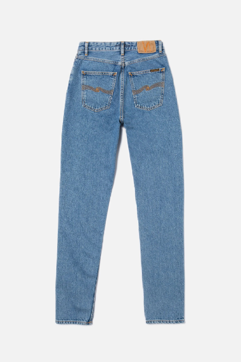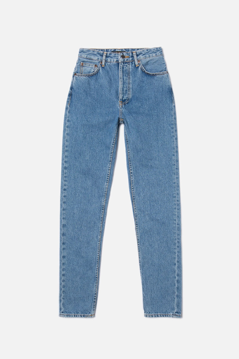 The very popular Breezy Britt from Gothenburg-based Nudie Jeans is a women's jean with a suitable high waist. The relaxed fit tapers moderately to the ankle. The jeans are made of one hundred percent cotton, which means that the denim fabric does not contain any stretch fibers. The fit that sits comfortably at the waist and the sturdy denim fabric give these pants the feel of genuine jeans.