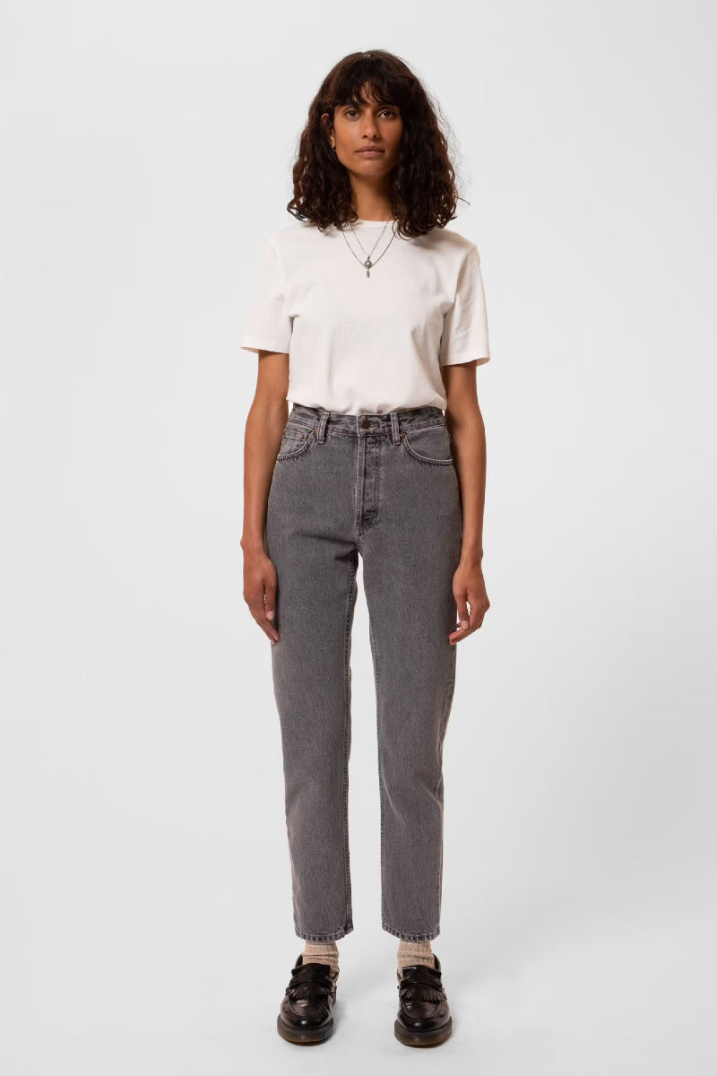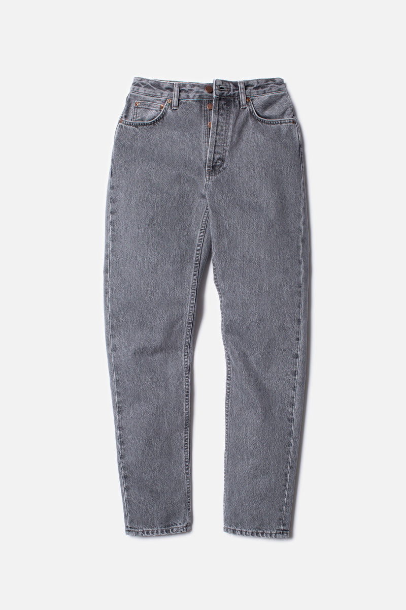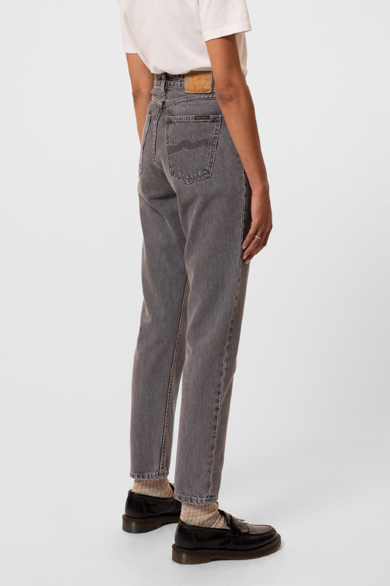 The very popular Breezy Britt from Gothenburg-based Nudie Jeans is a women's jean with a suitable high waist. The relaxed fit tapers moderately to the ankle. The jeans are made of 100% cotton, i.e. the denim fabric does not contain any elastic fibers. The fit that sits comfortably at the waist and the sturdy denim fabric give these pants the feel of genuine jeans.