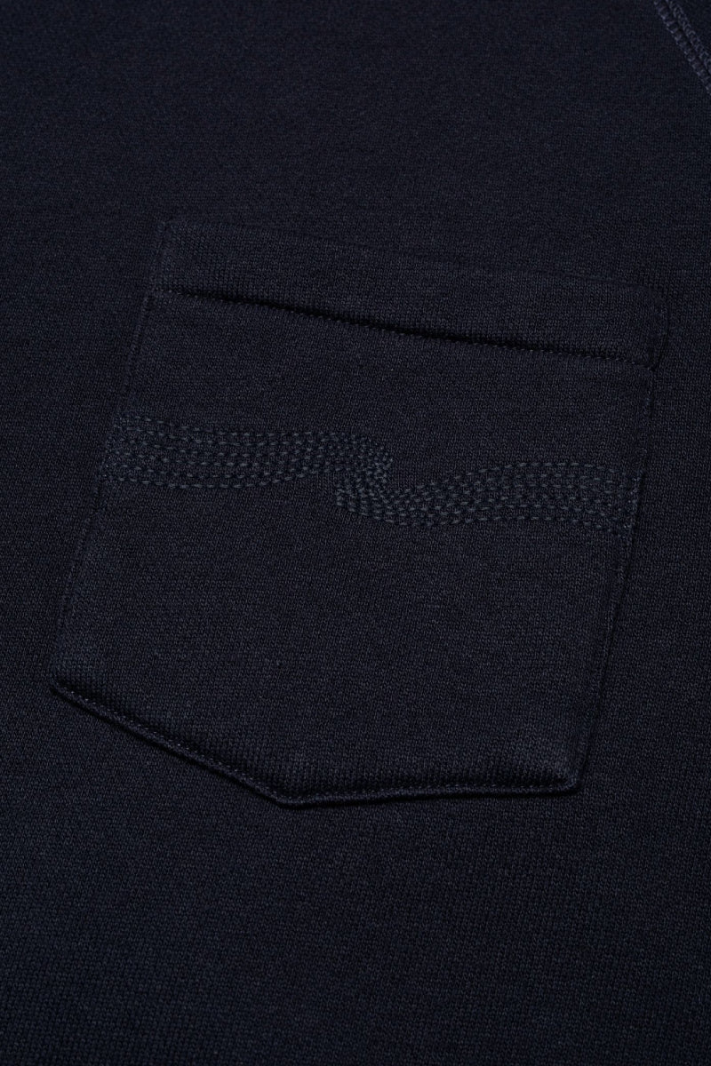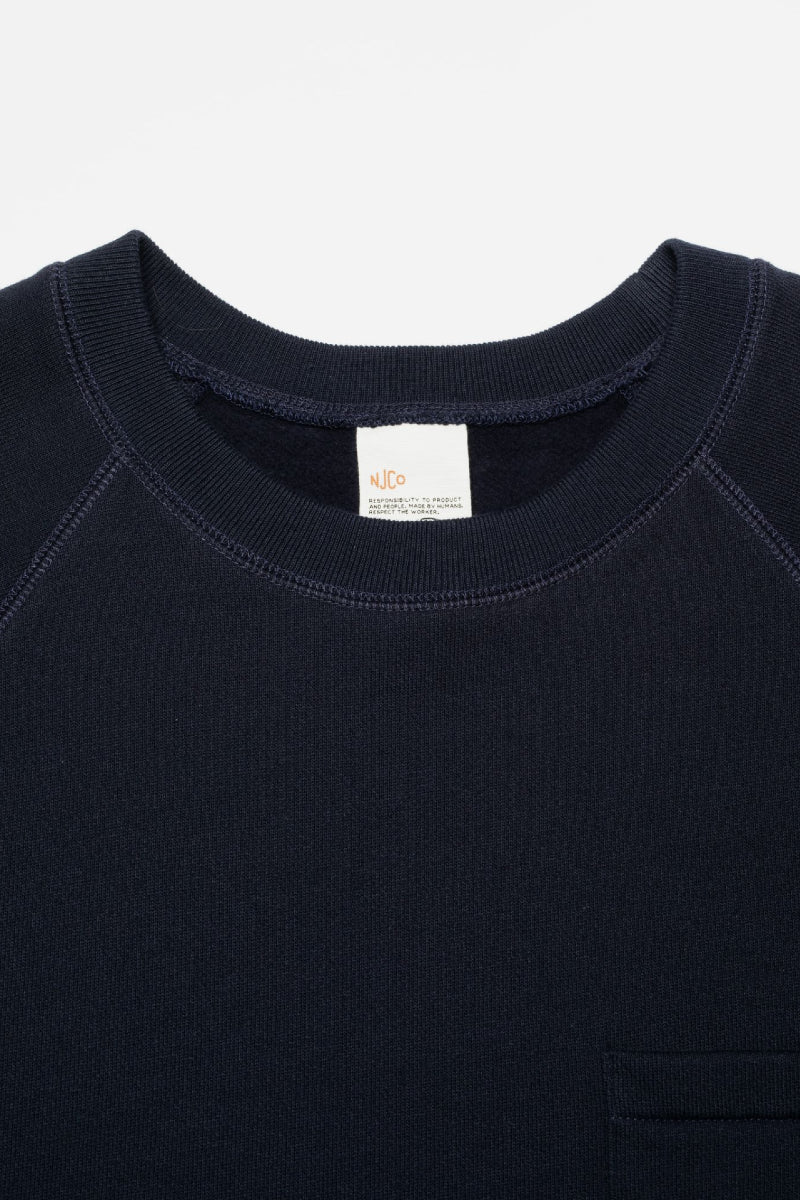 Kevyestä trikoosta valmistettu lyhythihainen collegepaita pehmeäksi harjatulla sisäpuolella. Paidassa pyöreä kaula-aukko, raglanhihat sekä yksi rintatasku Nudien farkuista tutulla takataskukirjonnalla.