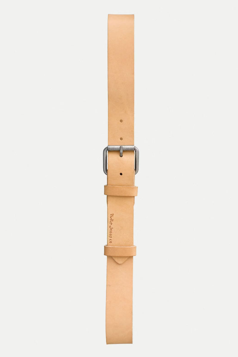 The classic men's denim belt is made of vegetable tanned leather and equipped with a metal buckle and two leather loops. Will age beautifully in use!