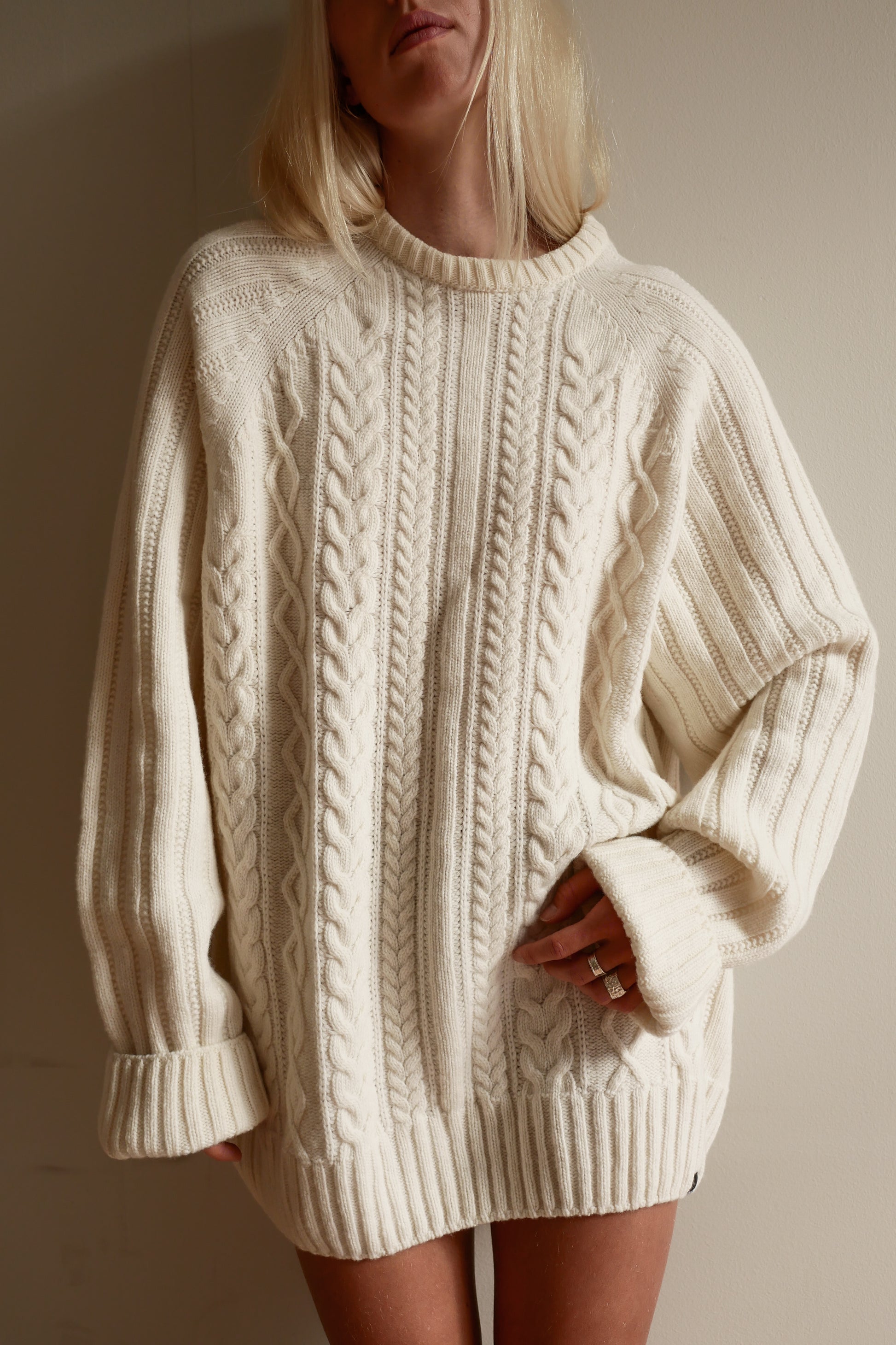 Oversize-mitoitettu luonnonvalkoinen palmikkoneule OUNCE garmentsilta. Väljä malli, joka taittuu monen toiveisiin talven luottoneuleesta. Kaunis fisherman's daughter henkinen-neulos luonnonvalkoisessa sävyssä. Pitkiin hihoihin voi kääriytyä ilmojen viiletessä tai ne voi halutessaan kääntää kerran, jotta ranteet näkyvät sirosti. Kaunis neulos on villamateriaalista huolimatta ilmava ja kevyt päällä. Valmistettu ja suunniteltu Suomessa sataprosenttisesta lampaanvillasta, joka ei kutita ihoa. Ajaton ja väljä malli, joka sopii kaikille.