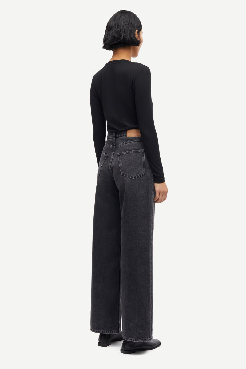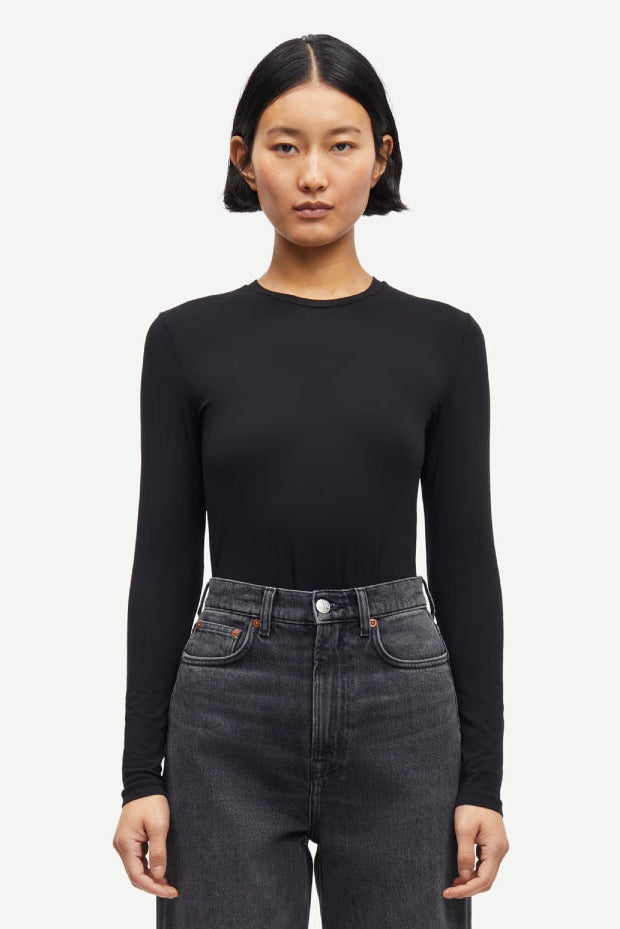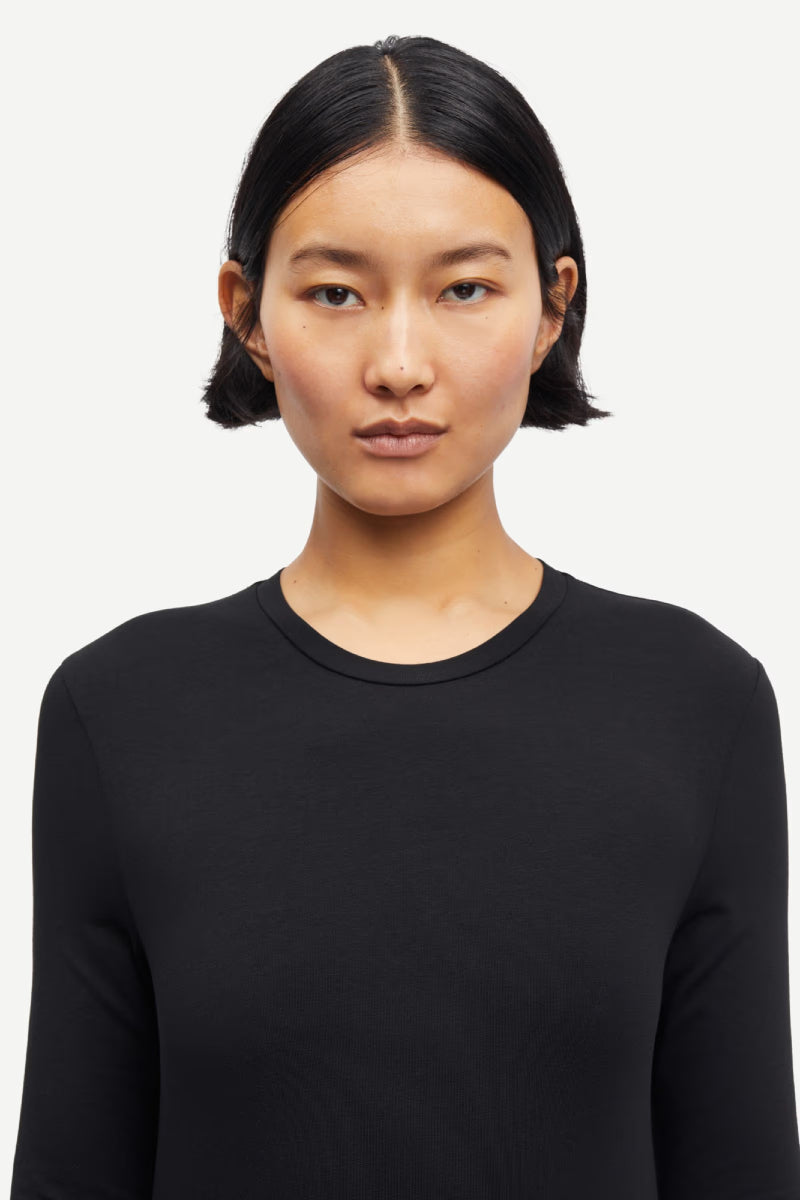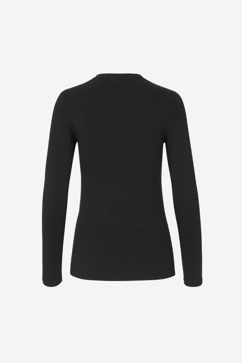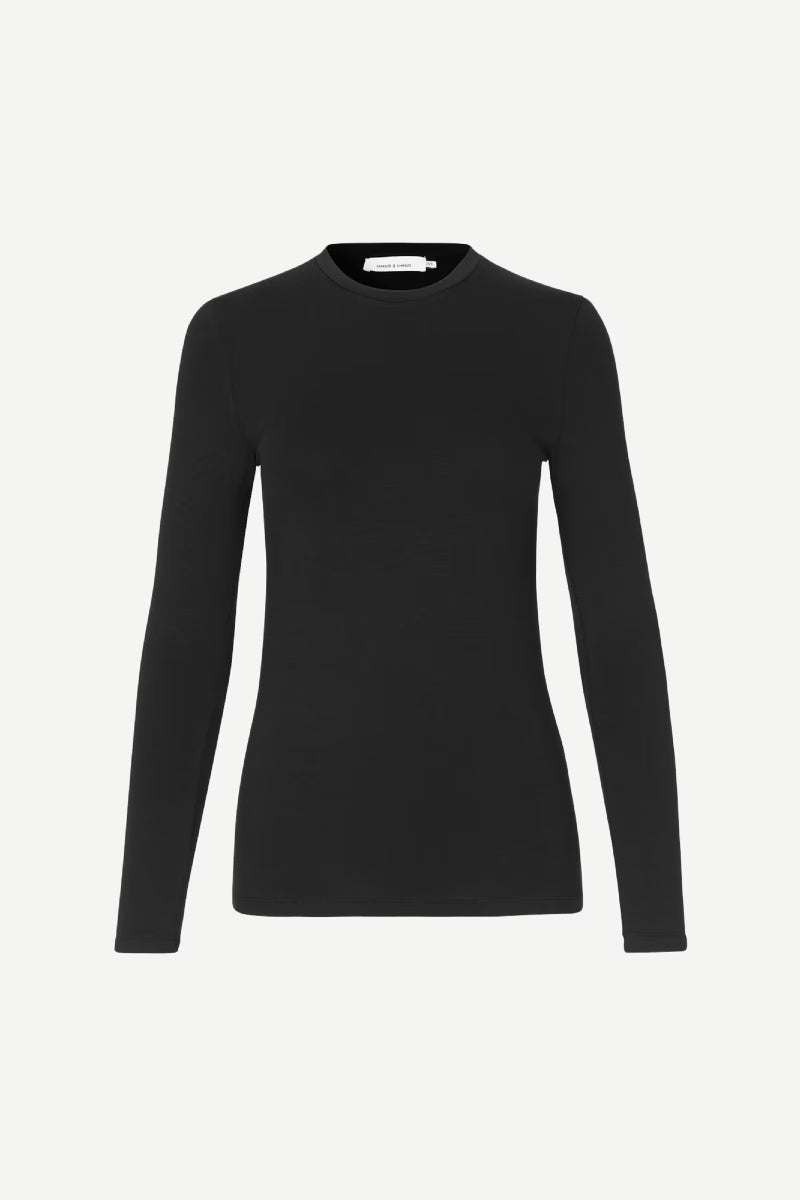 Musta pitkähihainen paita tanskalaiselta Samsøe & Samsøelta kapealla mallilla. Yksinkertainen siluetti tekee paidasta monikäyttöisen joko sellaisenaan tai paidan voi yhdistää myös kerrostettuun tyyliin. Materiaalisekoitus tekee paidasta pehmeän ja joustavan lisäten käyttömukavuutta.