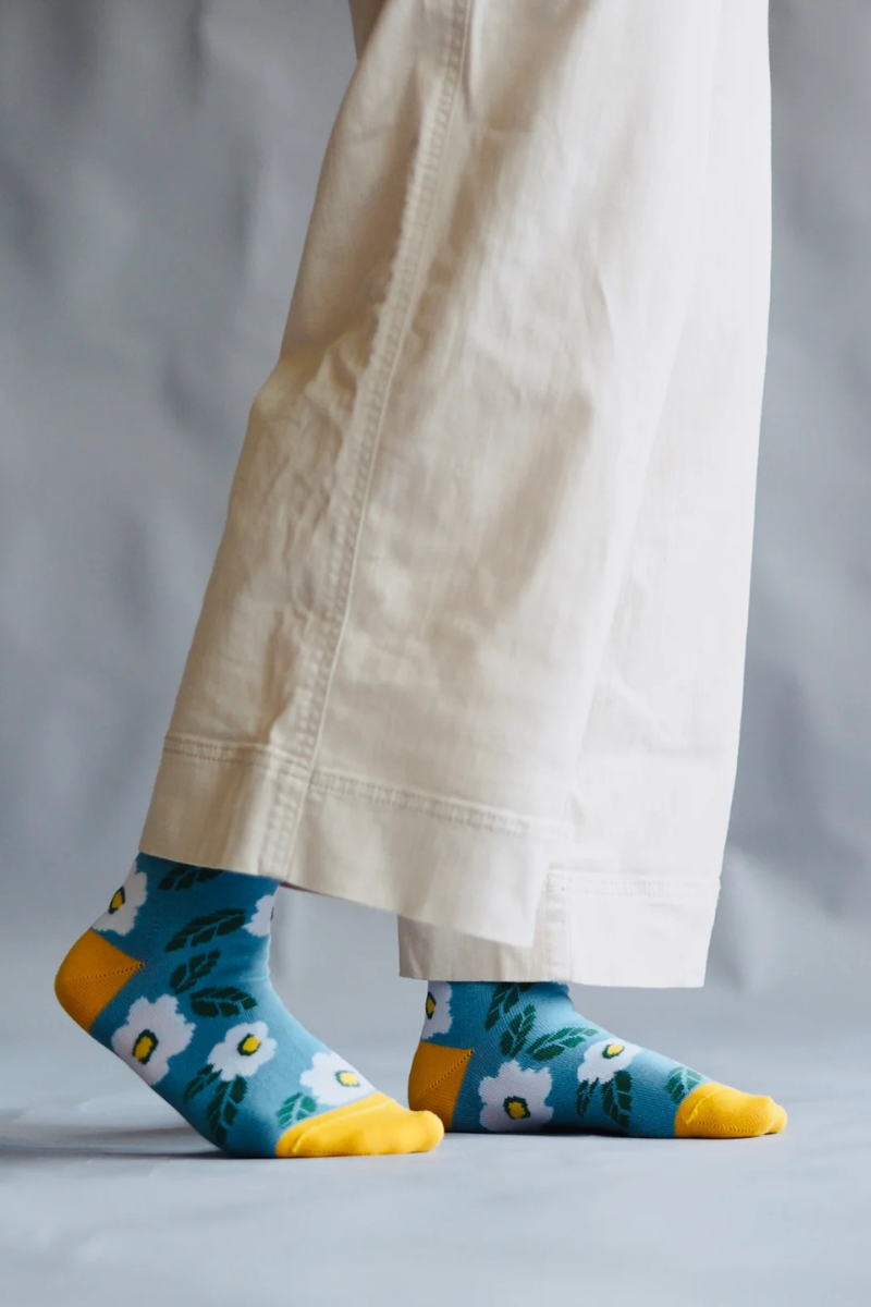 Flowers on monikäyttöinen kenkäsukka, joka ei hierrä tai purista, mutta pysyy silti vaivatta jalassa ilman valumista. Sukkien päämateriaali on sileä ja pehmeä GOTS-sertifioitu luomupuuvilla. Luomupuuvilla tuntuu miellyttävältä ihoa vasten, joten se sopii herkälle iholle ja sukkien kaltaisiin vaatteisiin, jotka ovat suorassa kosketuksessa ihoon. Materiaaliyhdistelmän ansiosta sukka kestää ahkeraa käyttöä, joustaa ja pysyy muodossaan.