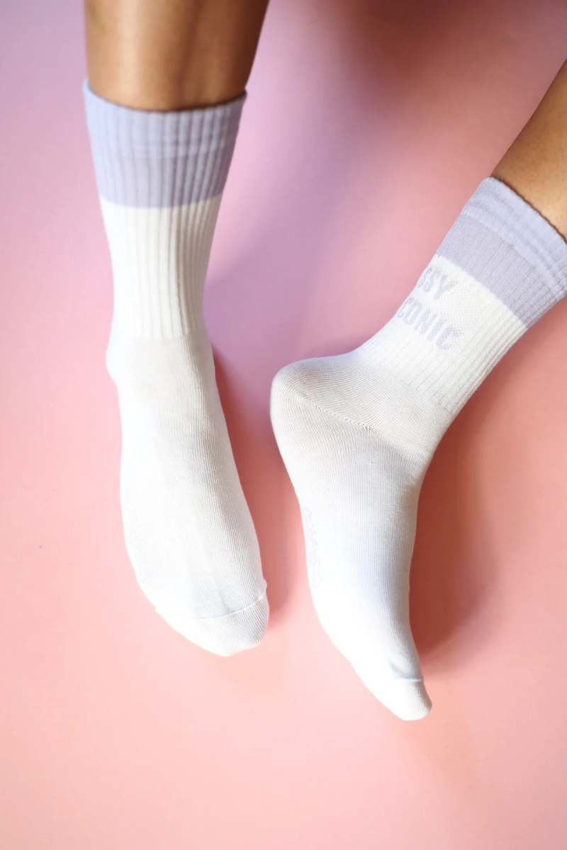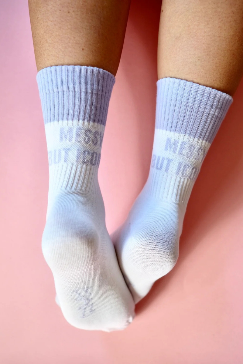 MESSY BUT ICONIC -sukka on sekoitus mukavuutta, asennetta ja pientä draamaa. Valmistettu pehmeästä, hengittävästä luomupuuvillasta, joka tuntuu hyvältä jaloissa ja tuo huumoria päivään.