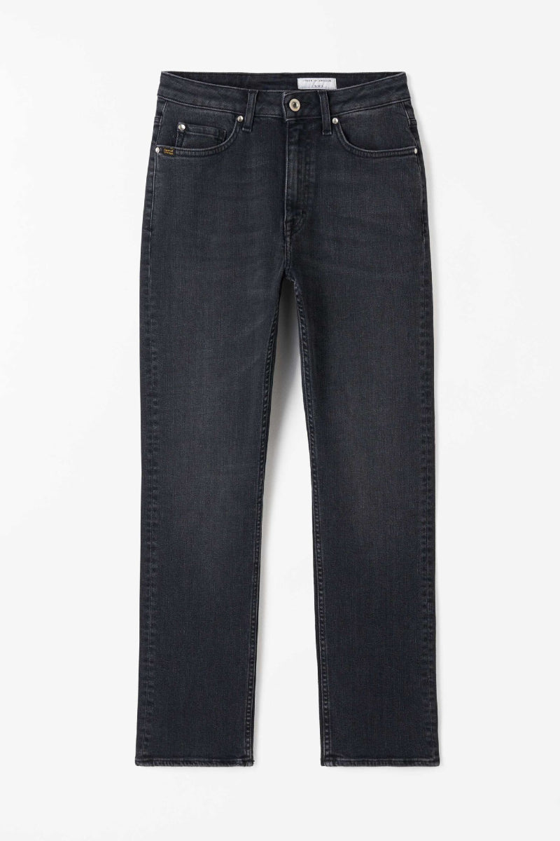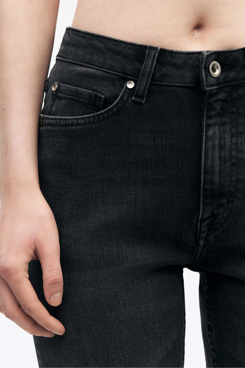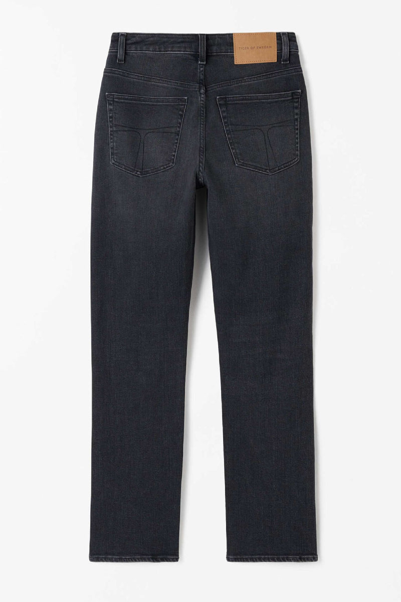 Slim fit jeans from the Swedish company Tiger of Sweden. A classic slant pocket model with a high waist and cropped, straight leg. Material: thick 12-ounce organic cotton with a little stretch. Laundry stylish black-grey.