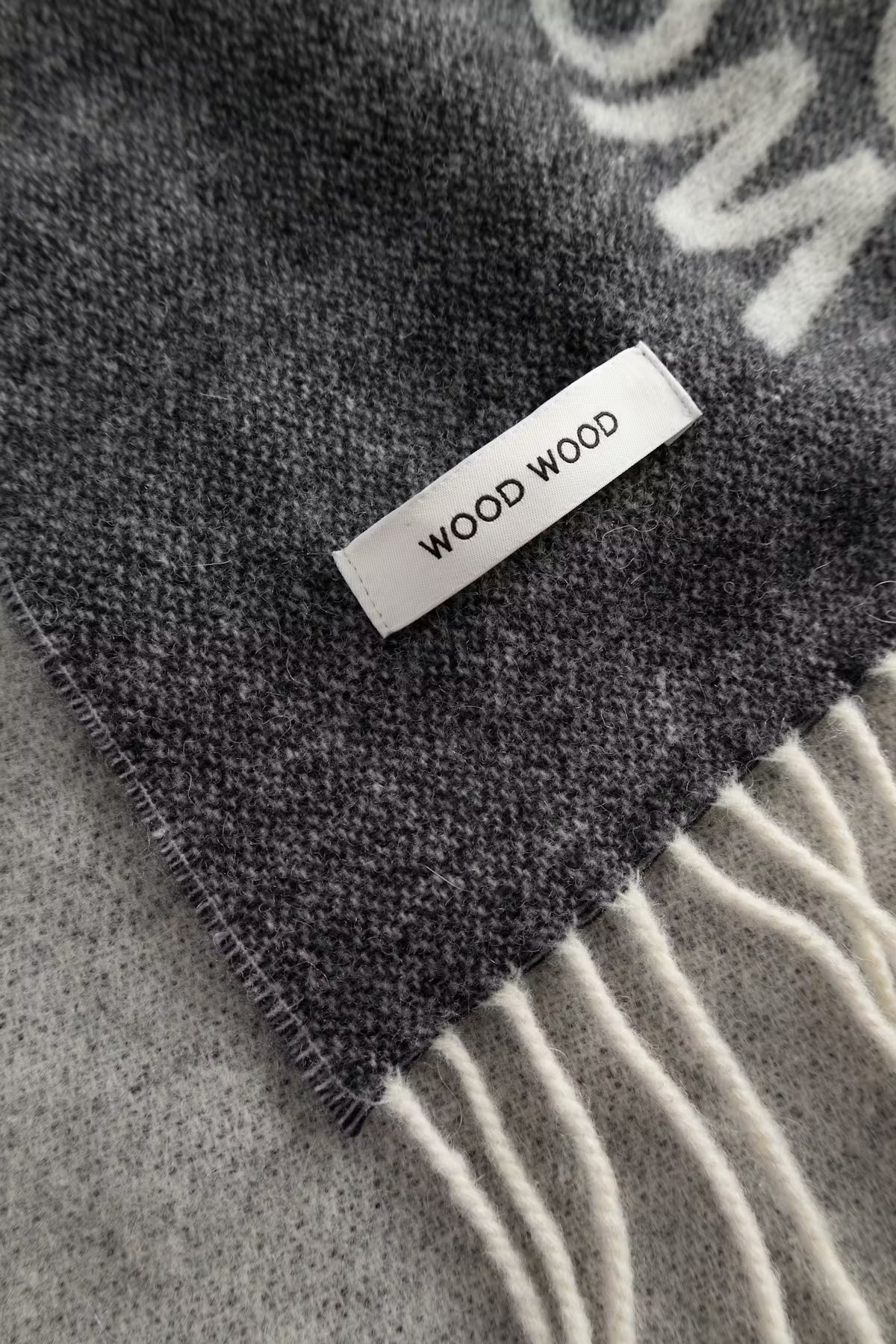 Pitkä, suorakulmainen huivi, jossa on pehmeä ja teksturoitu pinta sekä hapsureunat. Huivin toisella puolella on suuri kontrastiteksti, joka tuo rohkeaa ilmettä sen pelkistettyyn muotoon.