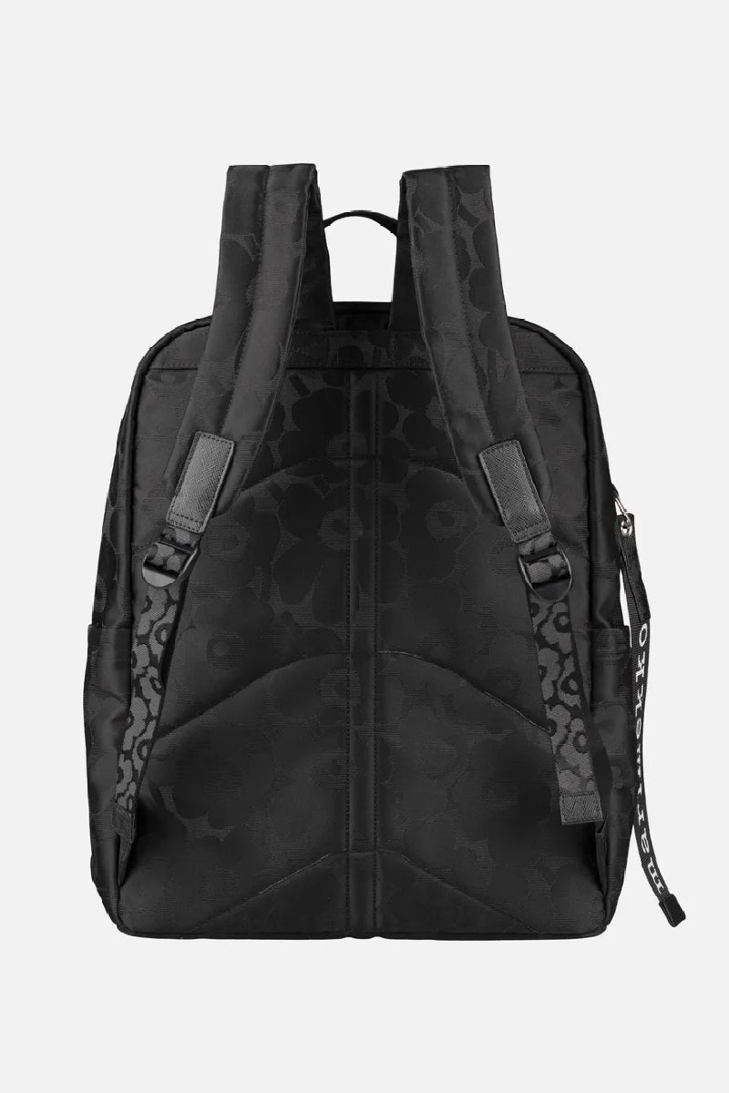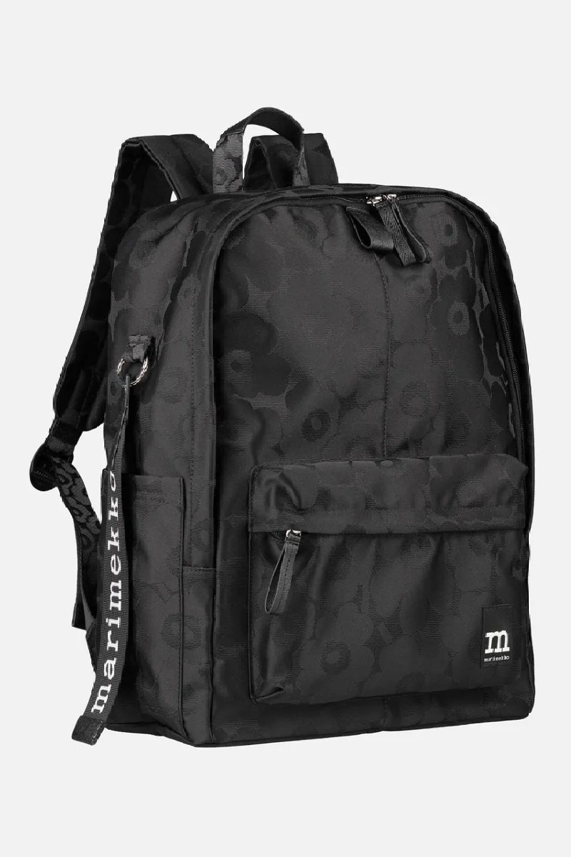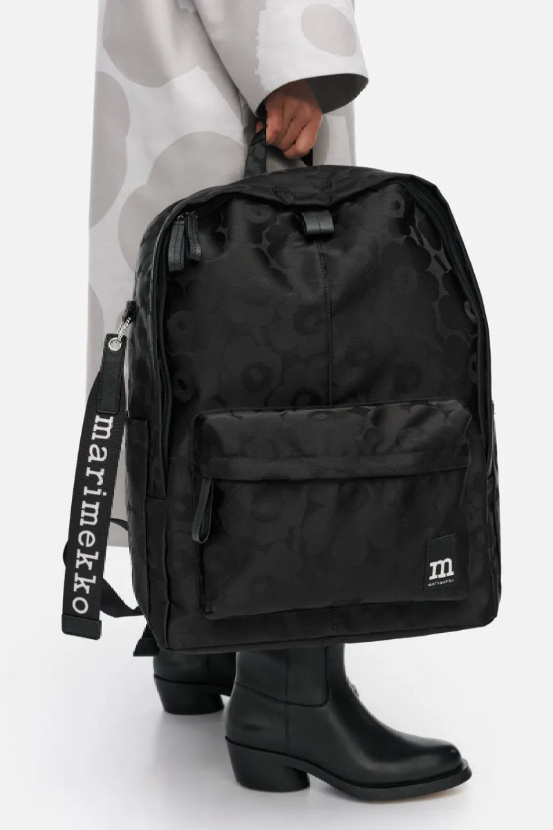 Zip Top Backpack -reppu on valmistettu kierrätetystä polyesterista ja siinä on Unikko-kuosi. Tilava reppu sulkeutuu vetoketjulla, siinä on yksi iso vetoketjutasku etupuolella sekä sivuissa avoimet taskut. Sisäpuolella on iso pehmustettu tasku kannettavaa tietokonetta varten. Säädettävissä olkahihnoissa on pehmusteet. Toisella sivulla roikkuu Marimekko-avaimenperä ja edessä on Marimekko-tuotemerkkilappu. Tuotteessa on nahkaisia yksityiskohtia.
