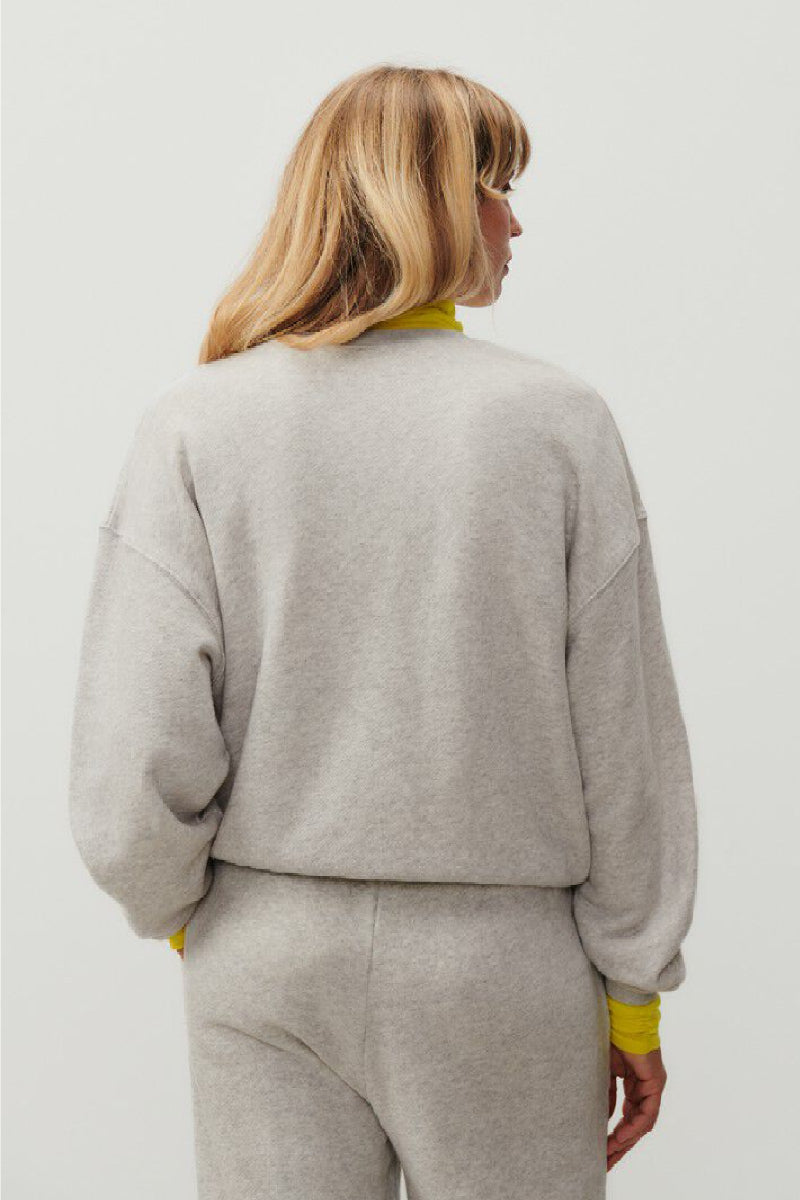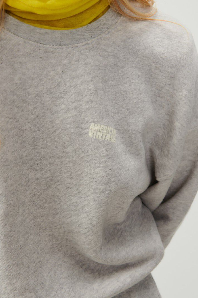 Pehmoinen harmaa collegepaita American Vintagelta. Paidassa on rento ja aavistuksen ylimitoitettu istuvuus, pyöreä pääntie ja tiputettu olkapäälinja. Yksityiskohtana edessä logoprintti.
