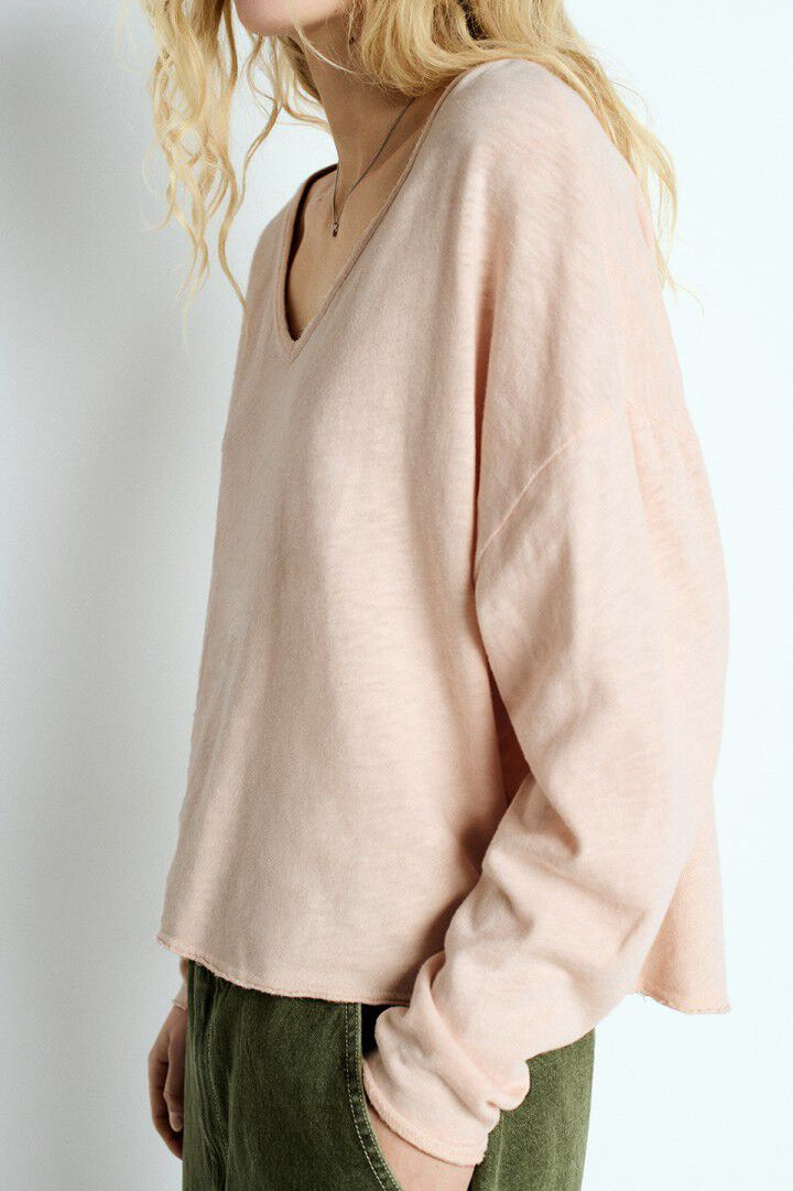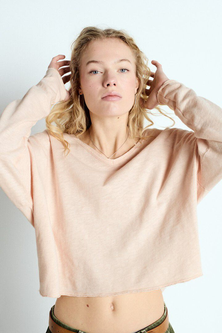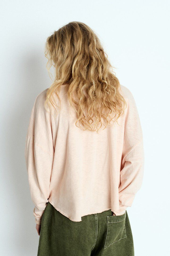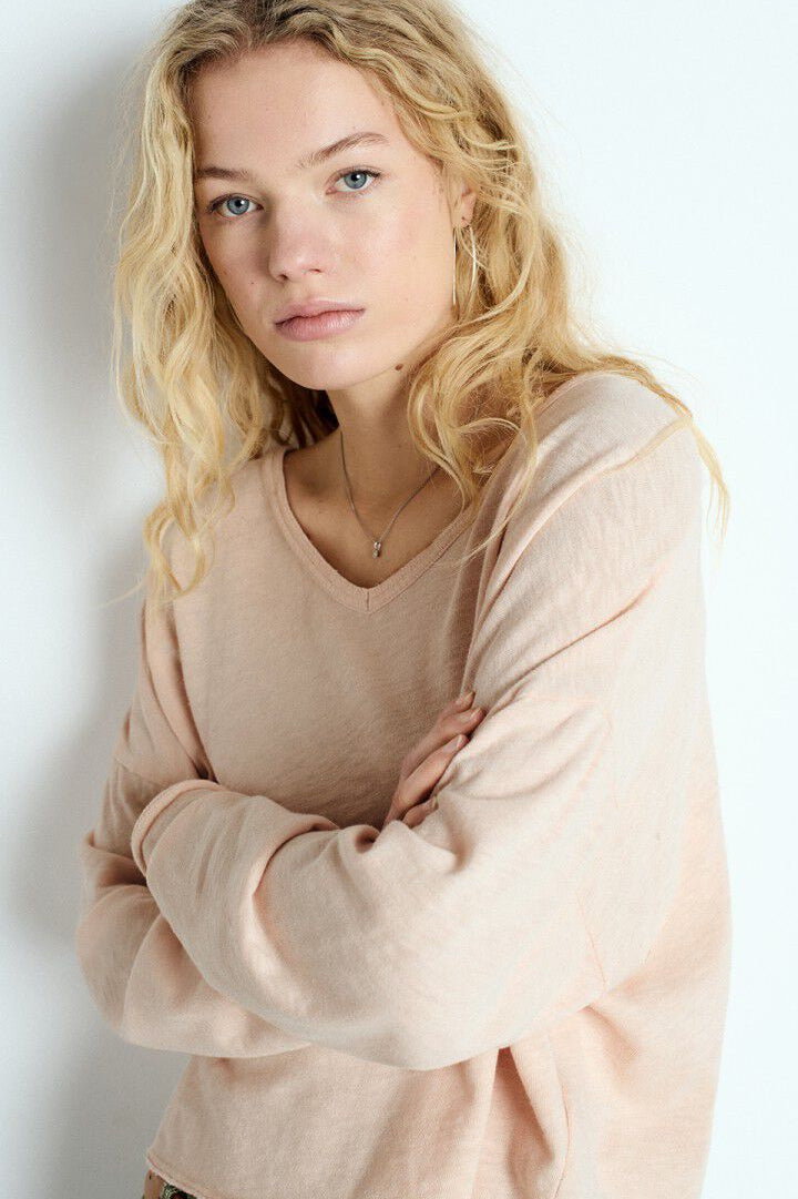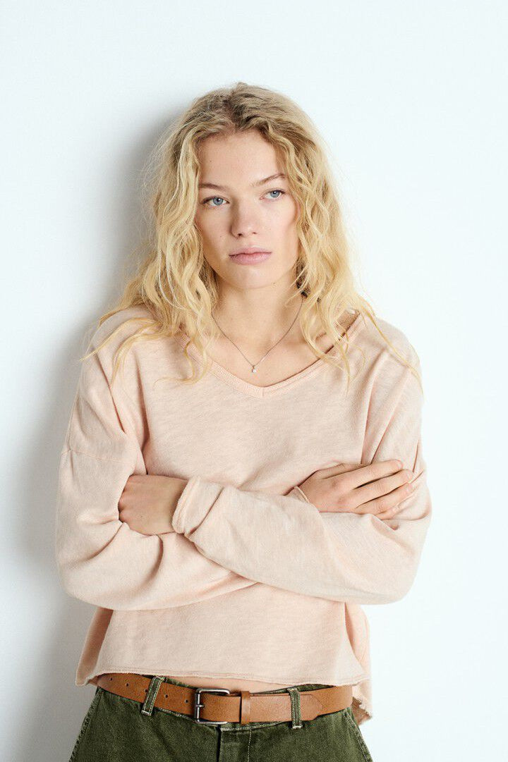 Ajaton ja mukava V-pääntiellä varustettu pitkähihainen paita American Vintagelta. Kevyt ja hengittävä kangas tekee paidasta täydellisen arjen luottovaatteen, jota on helppo yhdistellä niin farkkujen kuin suorien housujen kanssa.