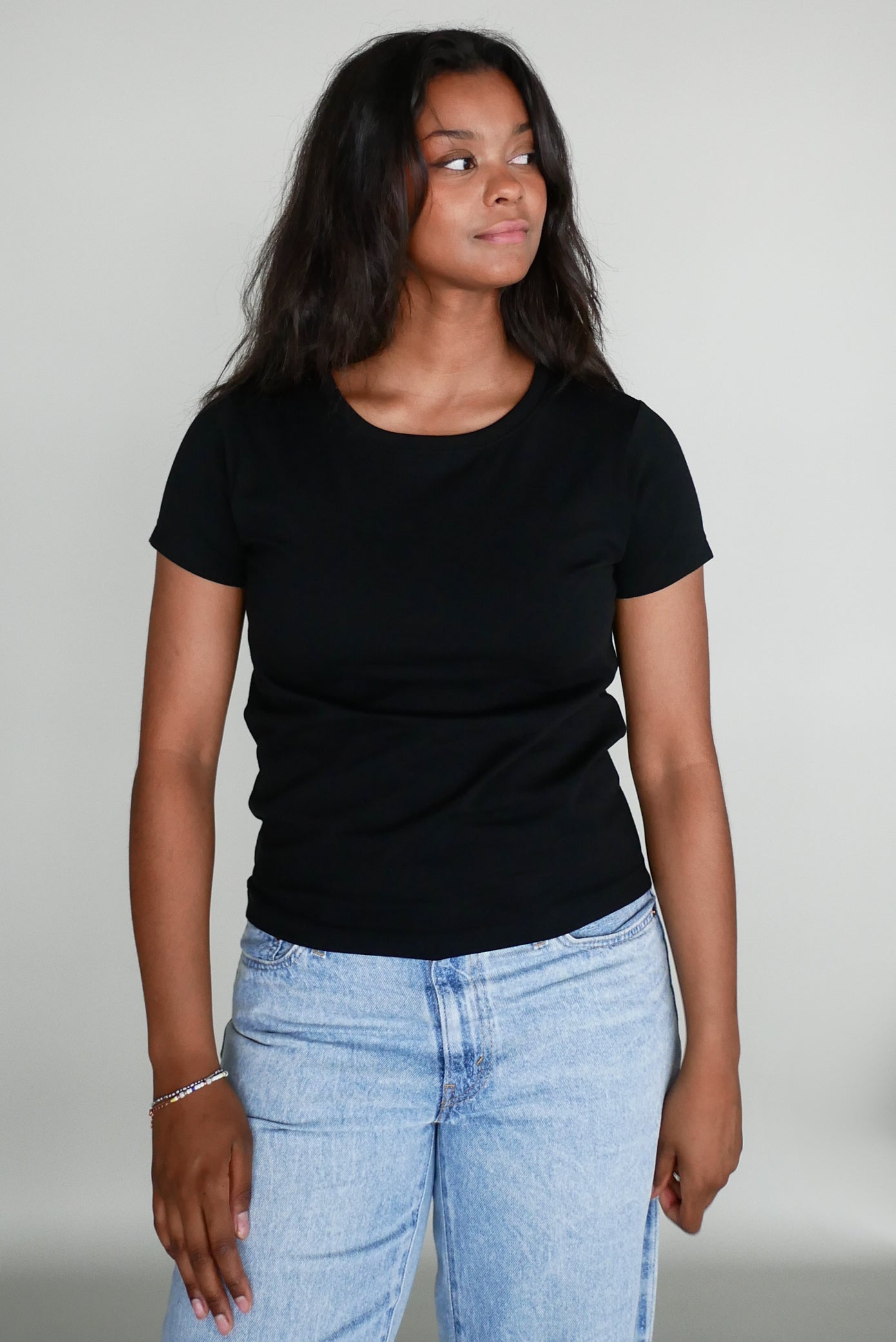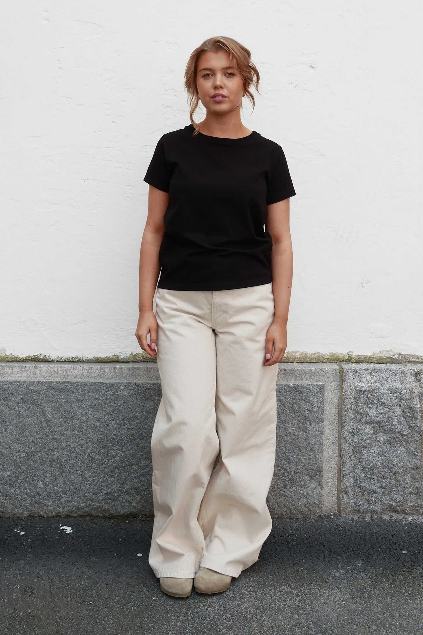 Kotimaisen Arelan suunnittelema ja täydellisyyteen hioma basic-t-paita korkealaatuisesta puuvilla-elastaani neuloksesta.