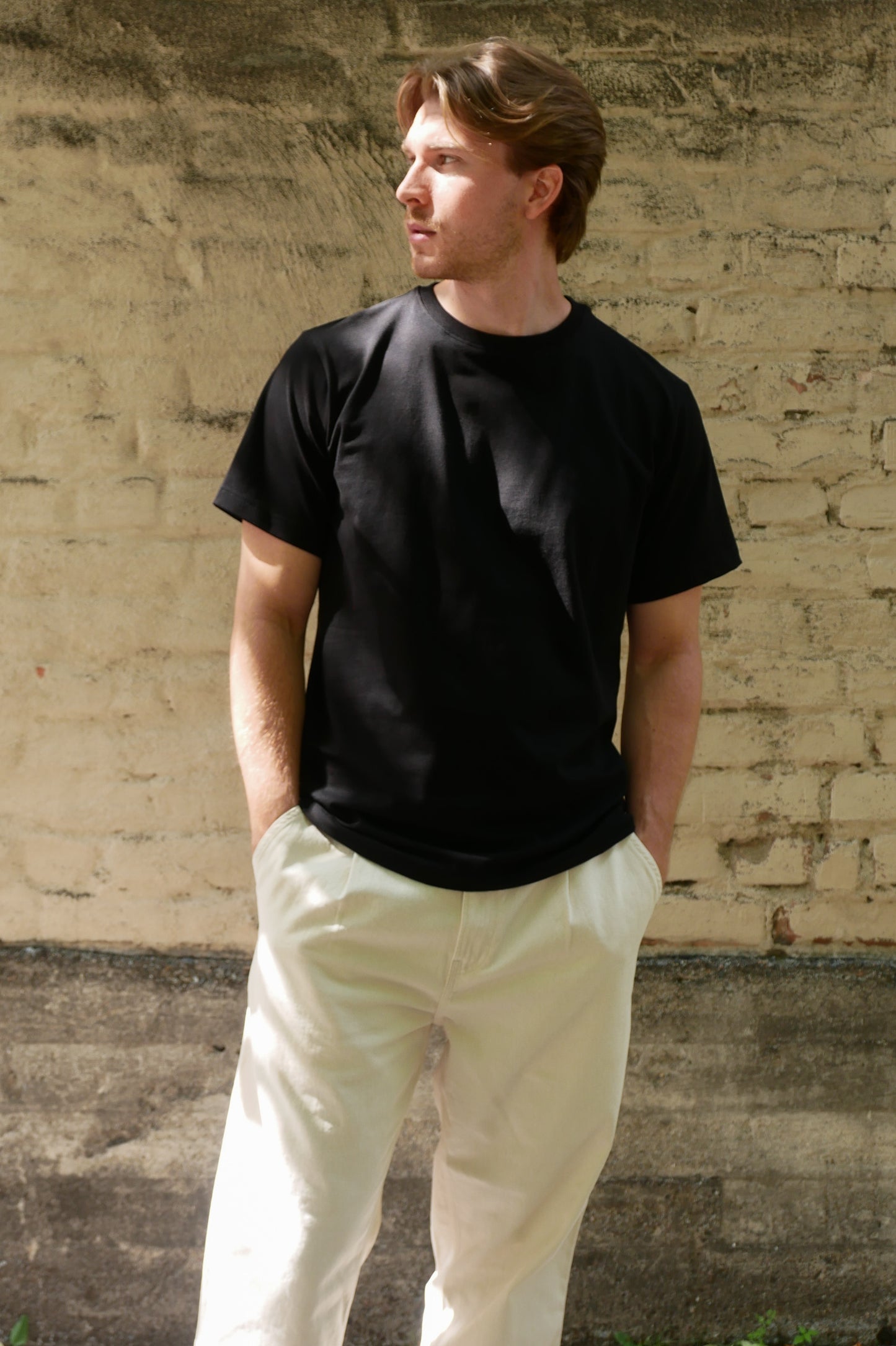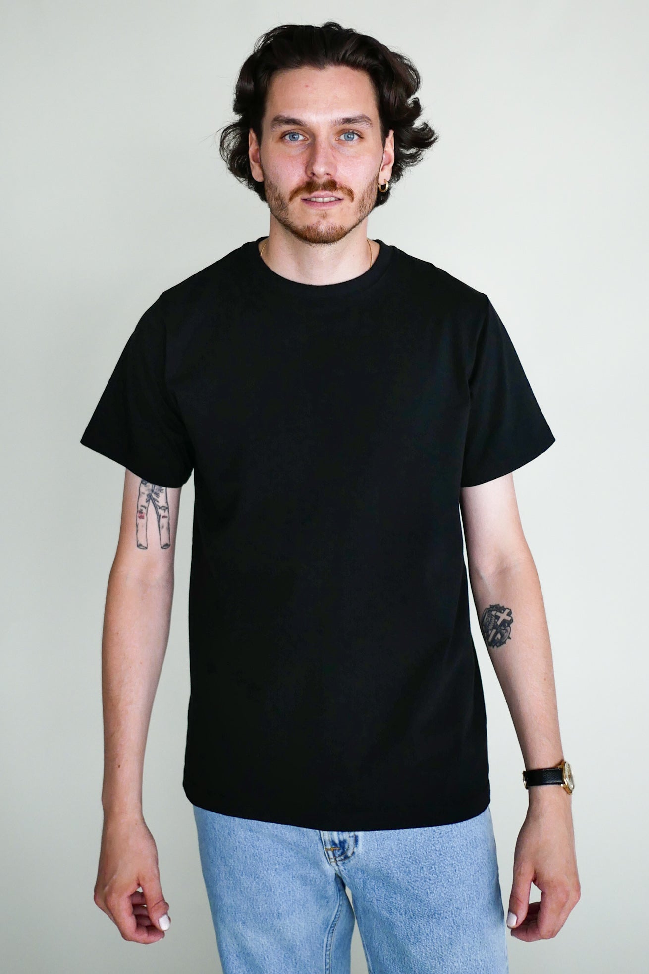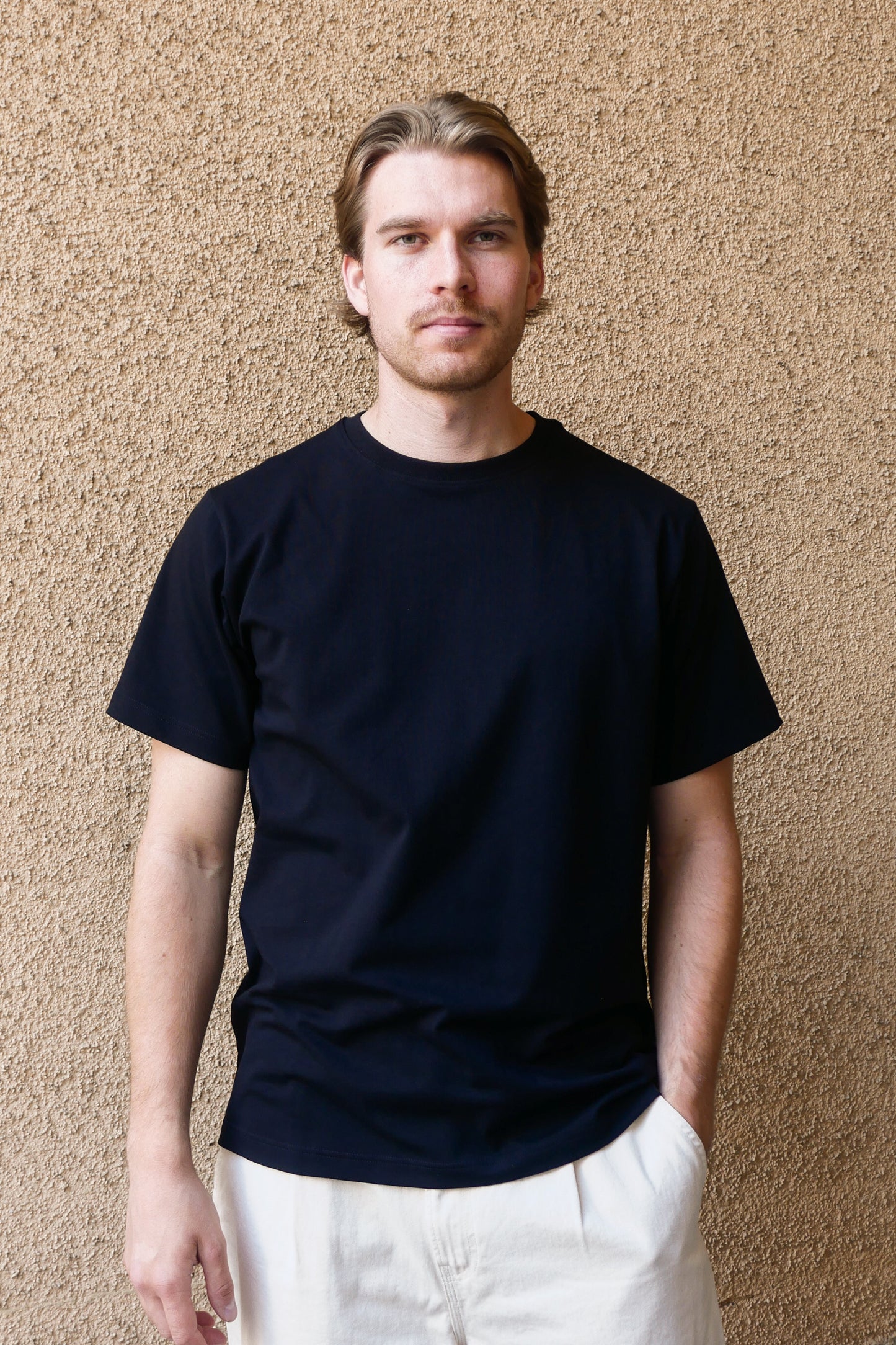 Kotimaisen Arelan suunnittelema ja täydellisyyteen hioma miesten basic-t-paita korkealaatuisesta puuvilla-elastaani neuloksesta.