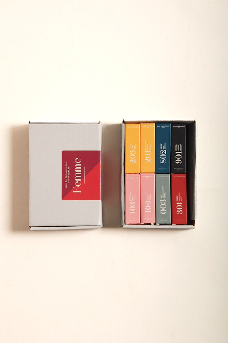 Kahdeksan laadukkaan Bon Parfumeur tuoksun kuratoitu 'Femme' -testerisetti esittelee suosituimpia naisten tuoksuja.