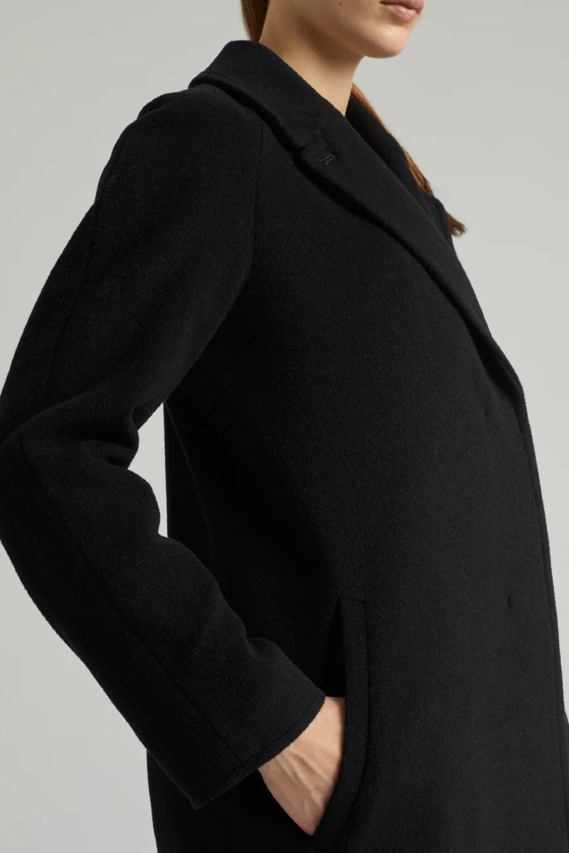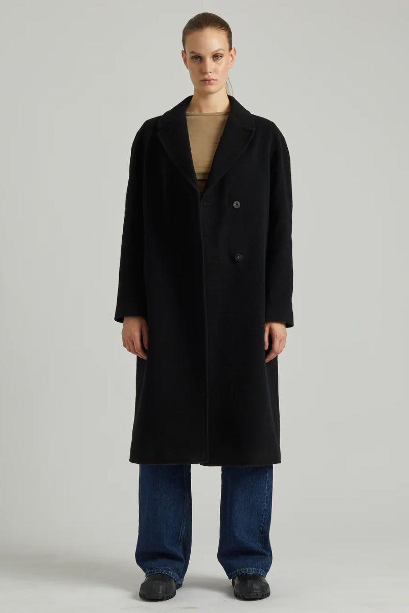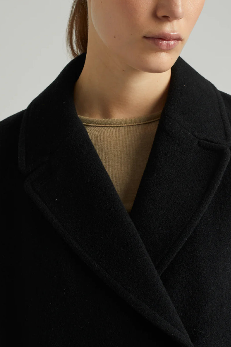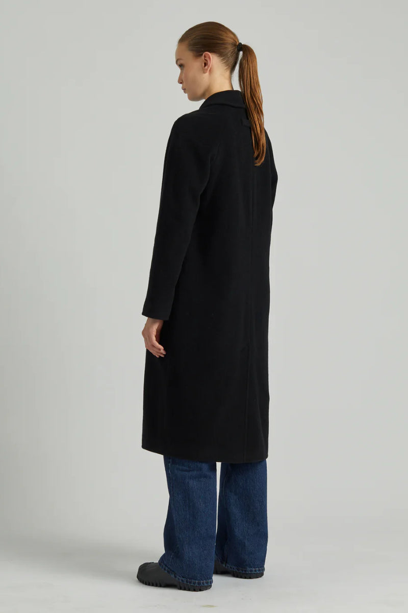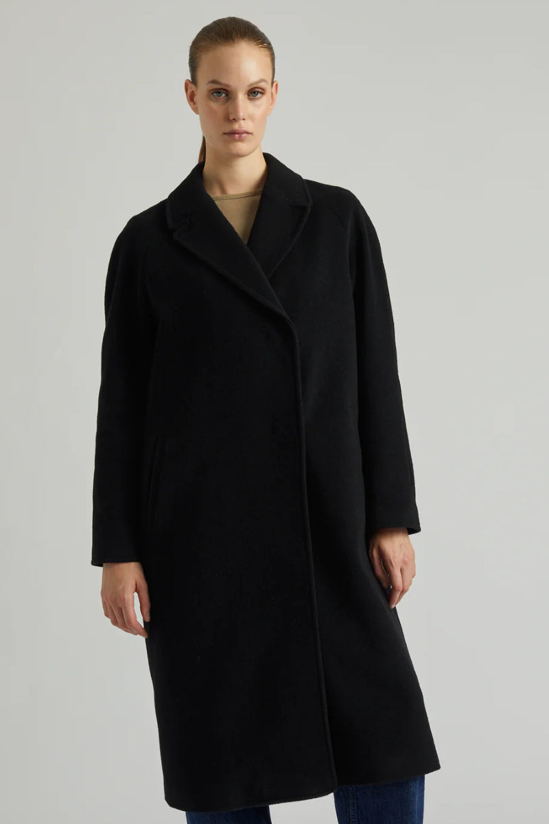 Kierrätetystä villasekoituksesta valmistettu villakangastakki Brixtol Textilesiltä. Kierrätysvilla on peräisin käytöstä poistetuista villatekstiileistä, jonka jälkeen se on jalostettu, puhdistettu, sitten valmistettu uusiksi kuiduiksi ja langoiksi ja edelleen kankaaksi. Syntyneestä korkealaatuisesta kankaasta takki on kudottu Italiassa. Pohkeen puoliväliin ulottuva pituus, käänteinen kaulus ja tyylikäs käännepääntie viimeistelee klassisen mustan villakangastakin. Mallissa on raglanhihat ja suora mutta rento siluetti.