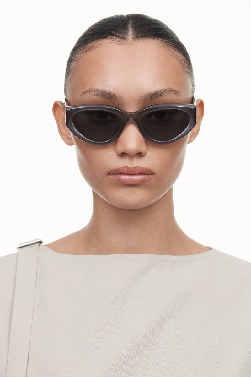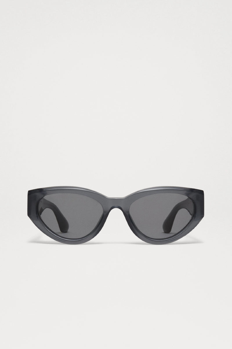 Modernit kissansilmäkehykset, jossa on suoraviivaiset sangat. Viistot leikkaukset lisäävät kaarevan siluetin syvyyttä, kun taas kulmikkaat kaaret tuovat laseisin viehätysvoimaa. Varustettu pehmeästi pyöristetyillä UV-suojaavilla CR39-linsseillä.