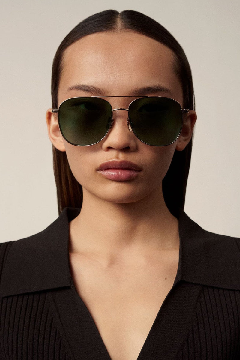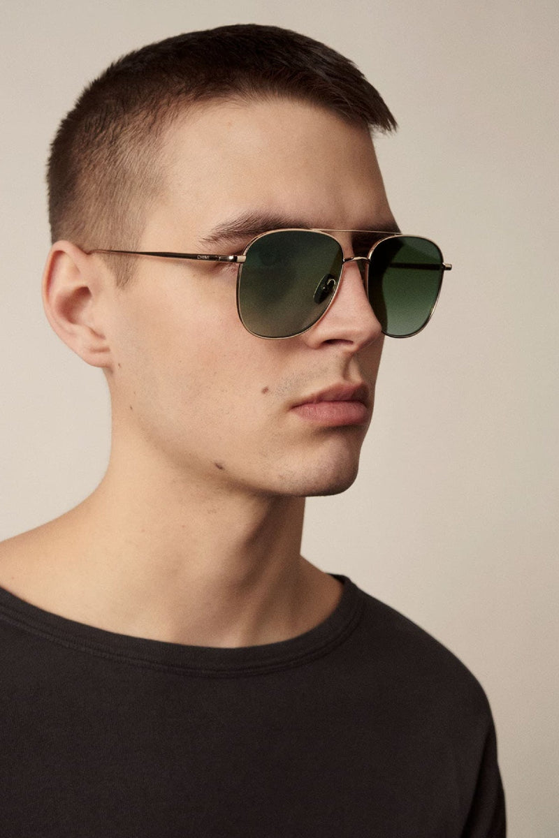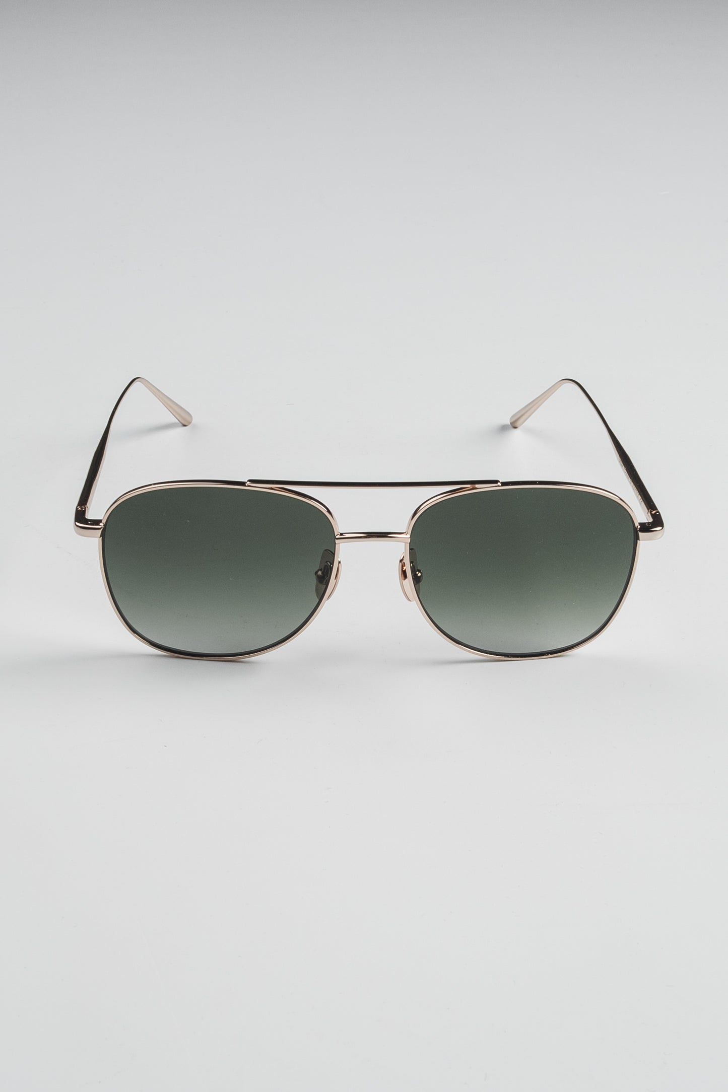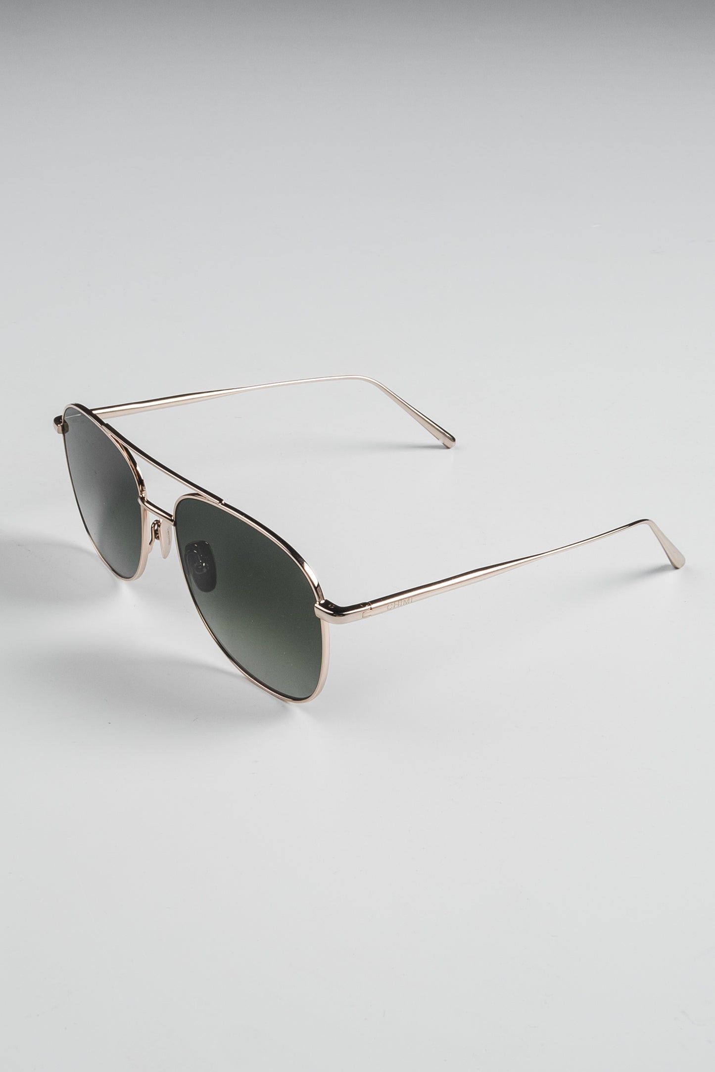 Klassiseen kulmaan muotoillut soikeat kehykset, joissa on suuret linssit. Kehykset on käsin muotoiltu himmeän kullan sävyisestä ruostumattomasta teräksestä, ja niissä on vihreät polarisoidut linssit.