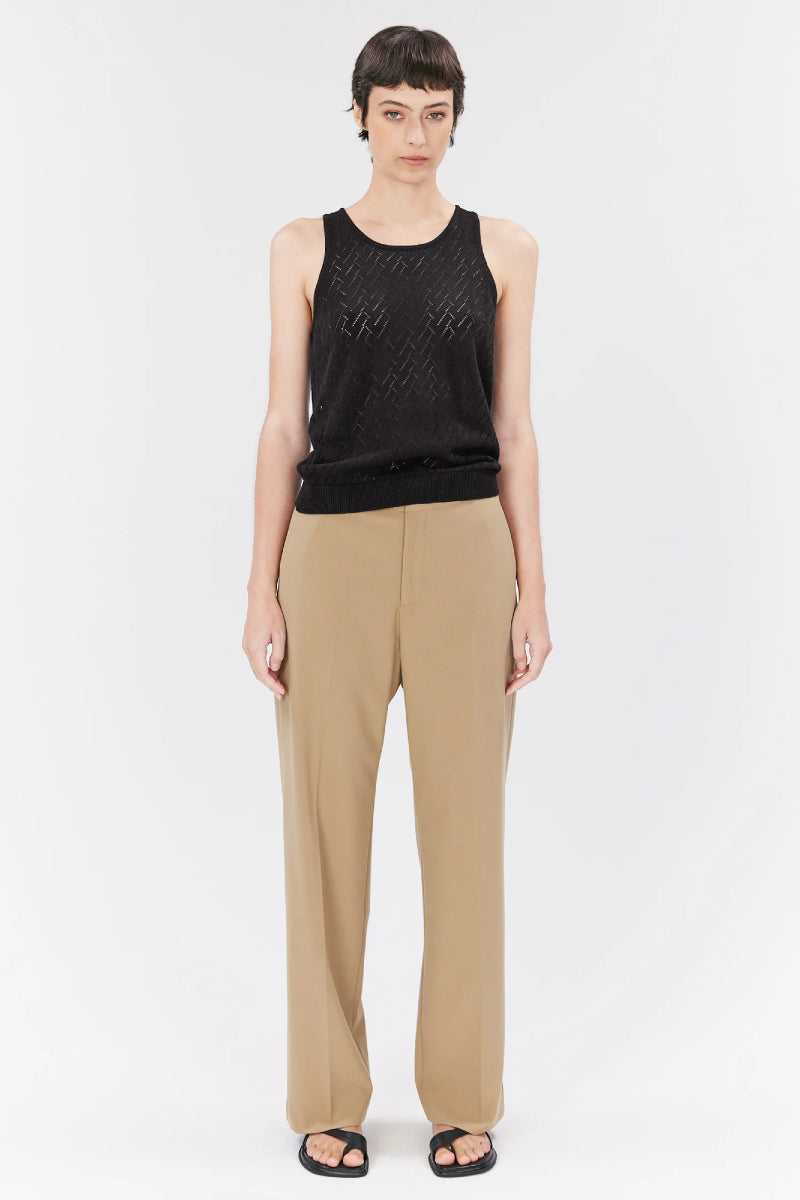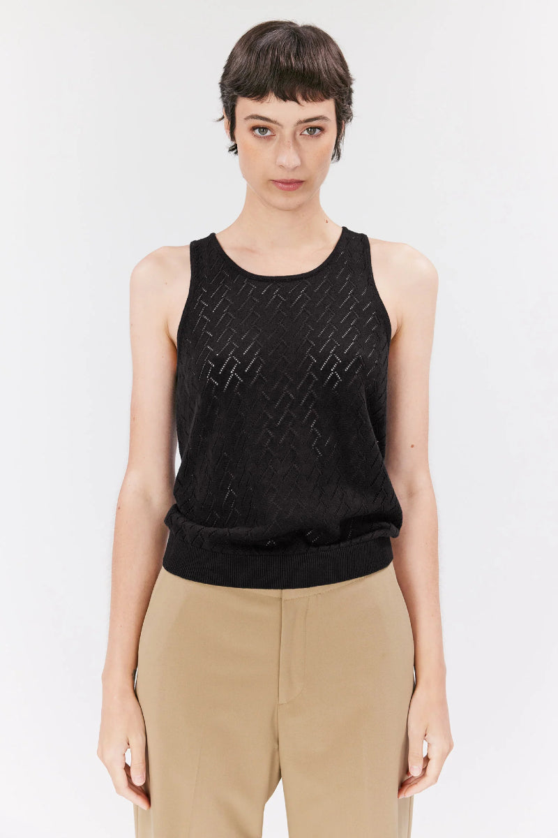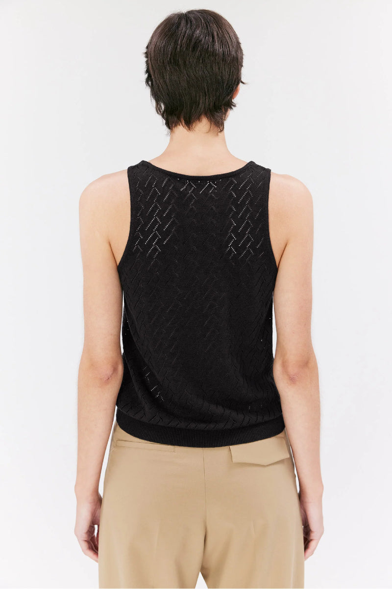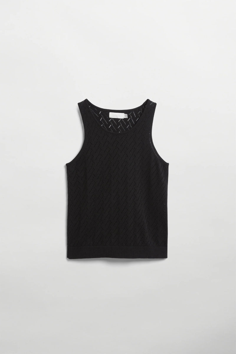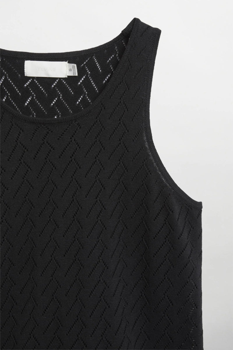 Kevyt neuletoppi Elvineltä. Valmistettu puuvilla-pellavasekoitteesta, joka yhdistää puuvillan pehmeyden ja pellavan kestävyyden. Materiaalit tekevät neuleesta ilmavan ja miellyttävän lämpimiin päiviin. Neuleessa on kaunis pointelle-neuloskuvio, joka tuo asuun herkkiä yksityiskohtia.