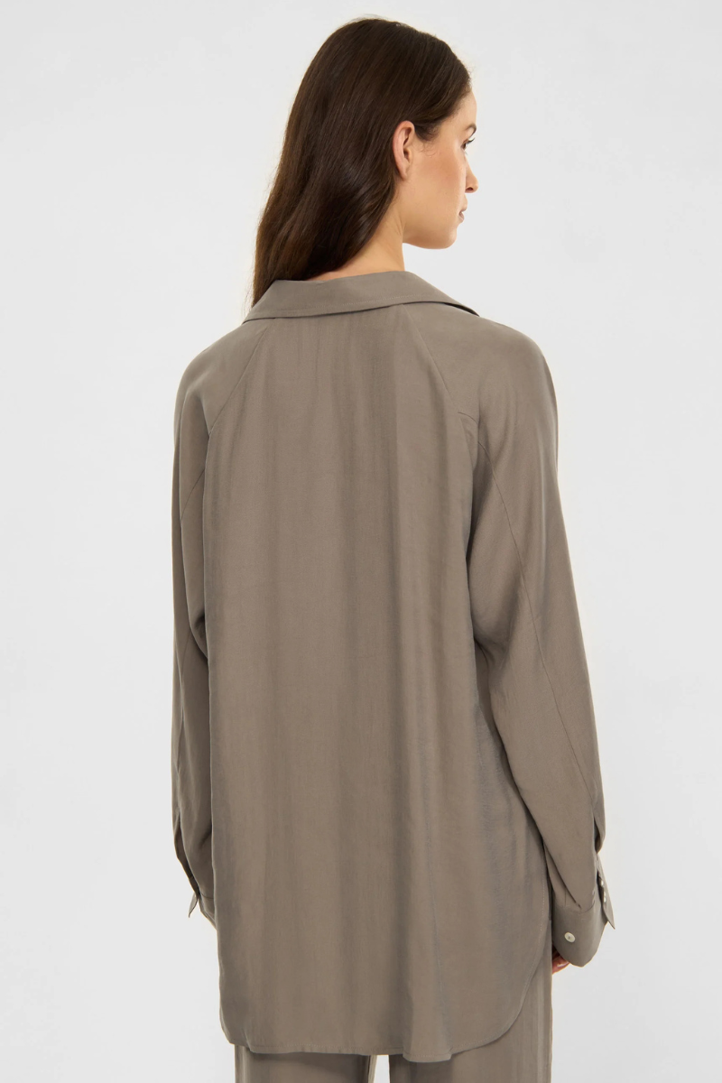 Ilmavasta ja kevyestä modaalisekoitteesta valmistettu kauluspaita Elvineltä. Rento malli avoimella pääntiellä, raglanhihoilla ja kaarevalla helmalla. Korkeat halkiot sivuissa. Yhdistä Elvinen Lana-housujen kanssa saadaksesi täydellisen yhtenäisen asukokonaisuuden.