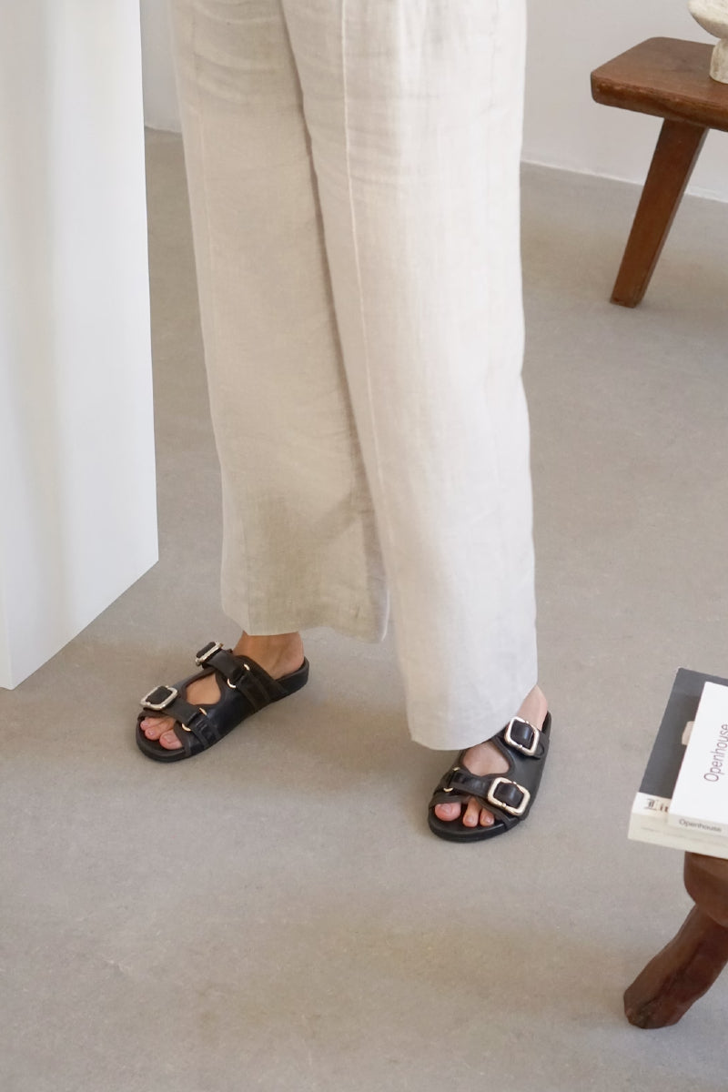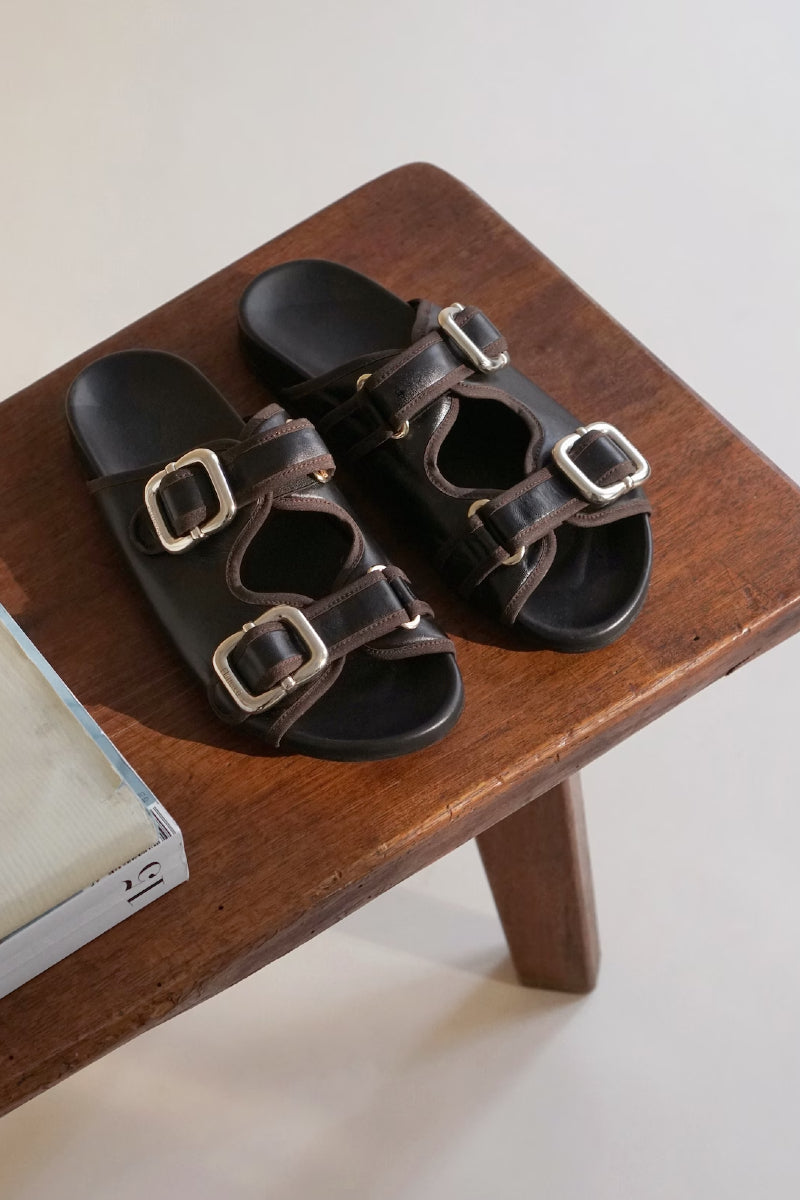 Minimalistiset sandaalit ruotsalaiselta Flatterediltä. Sandaalit on valmistettu sileästä nahasta ja niitä koristavat Flatteredin omat metallisoljet. Kenkä on normaali mitoitusta.