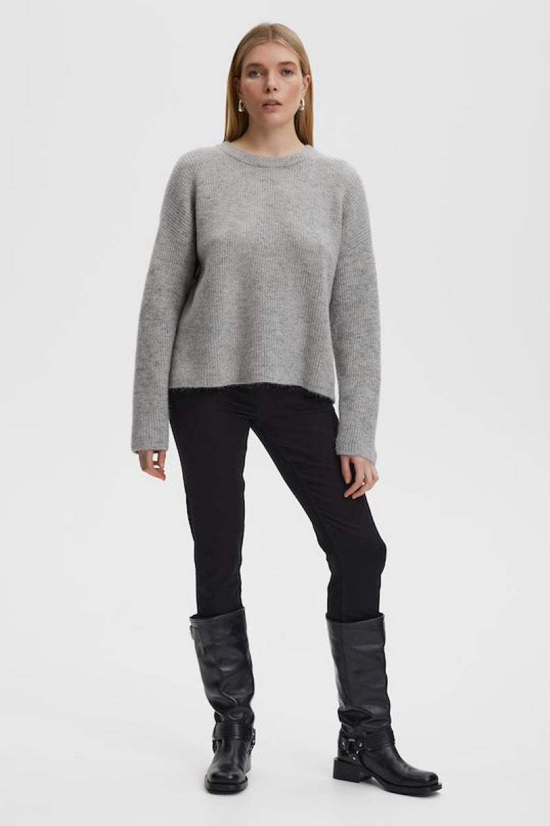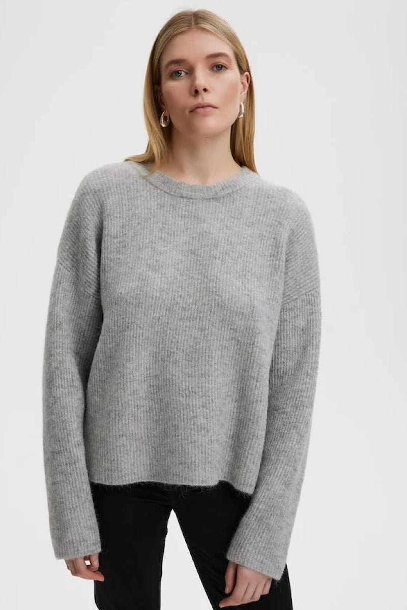 Upea neulepaita tanskalaiselta Gestuzilta. Monikäyttöinen vaaleanharmaa sävy pehmeästä alpakkasekoitteesta. Rento loose fit -malli tiputetuilla olkapäillä.